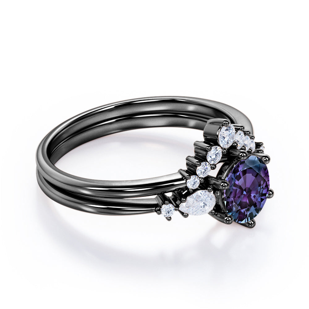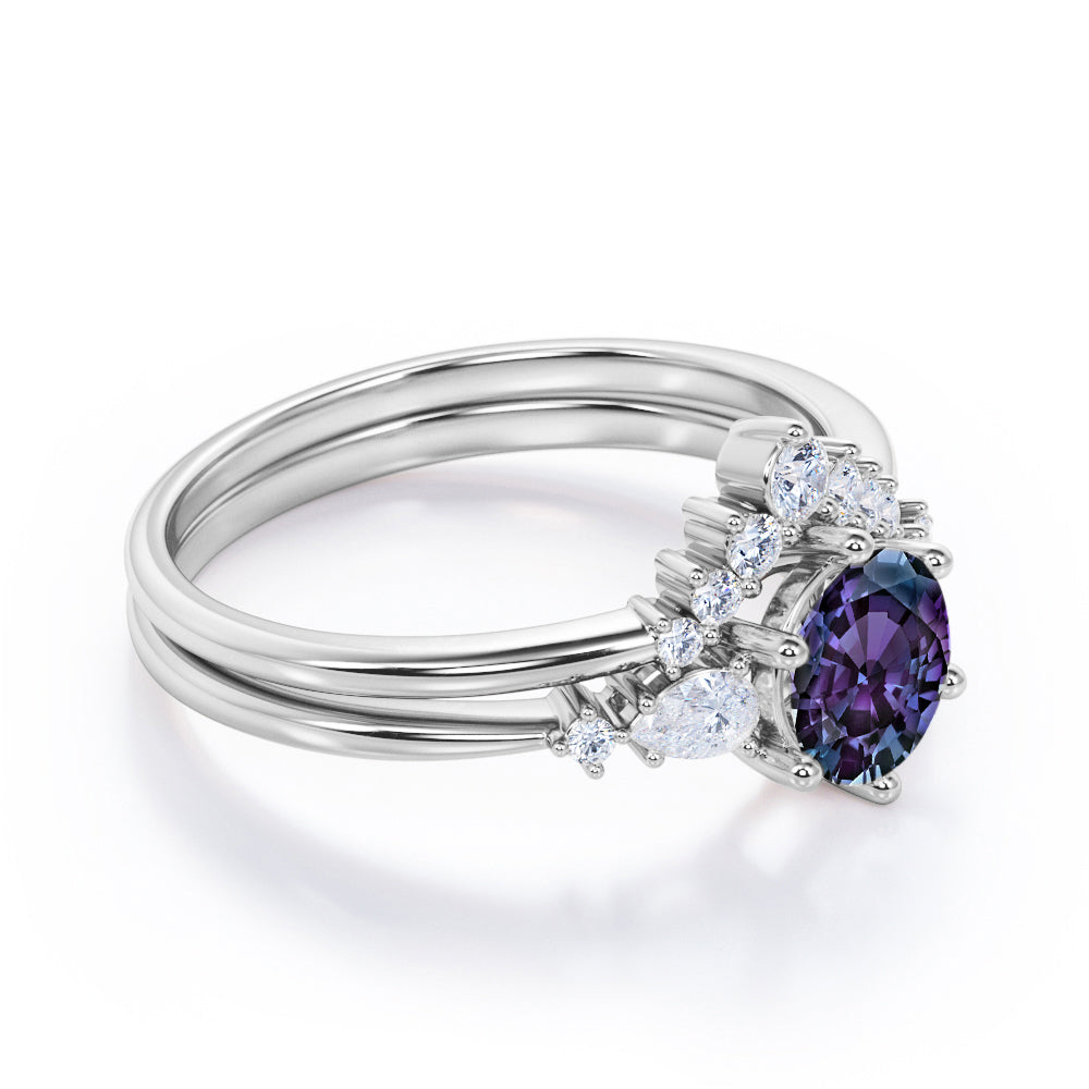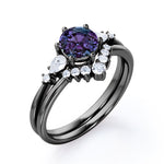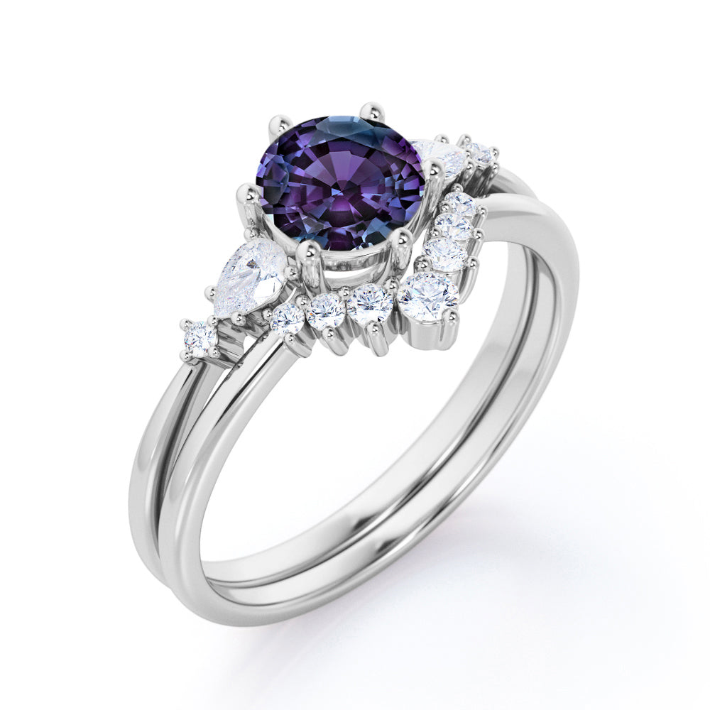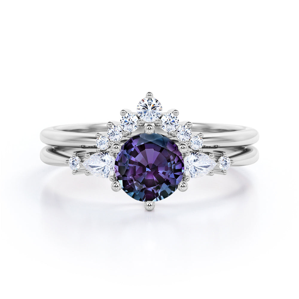 Five Stone 1.35 Carat Round Cut Lab Created Alexandrite And Diamond Tiara Style Bridal Set In White Gold. This is royalty at its best. An enchanting 1 carat vibrant purple alexandrite stone sits in the center of this masterpiece. Two pear and two round cut natural white diamonds accompanies the center stone in a plain white gold band. This round cut bridal set features an engagement ring and a matching tiara style wedding band which will definitely complement your overall ensemble. The five stone wedding ring set also symbolizes the five years of love anniversary and togetherness. 0.35 carat of white diamonds radiates unbelievable sparkle which will surely make you stand out in the crowd. Handmade with detailed attention by our artisans, this five stone 1.35 carat round cut lab created alexandrite and diamond tiara style bridal set in white gold can also be customized to 18k Gold plating over silver, 10k Gold or 14k Gold as per your desired choice.