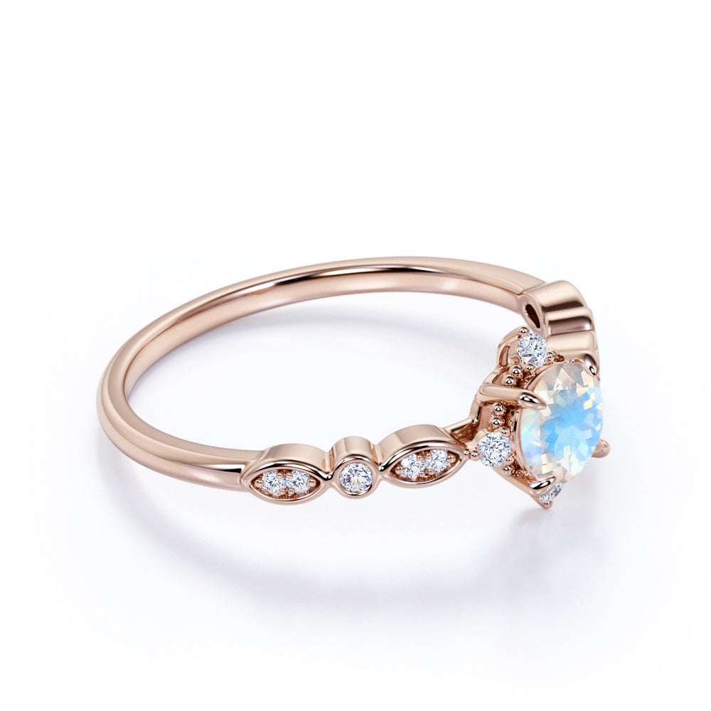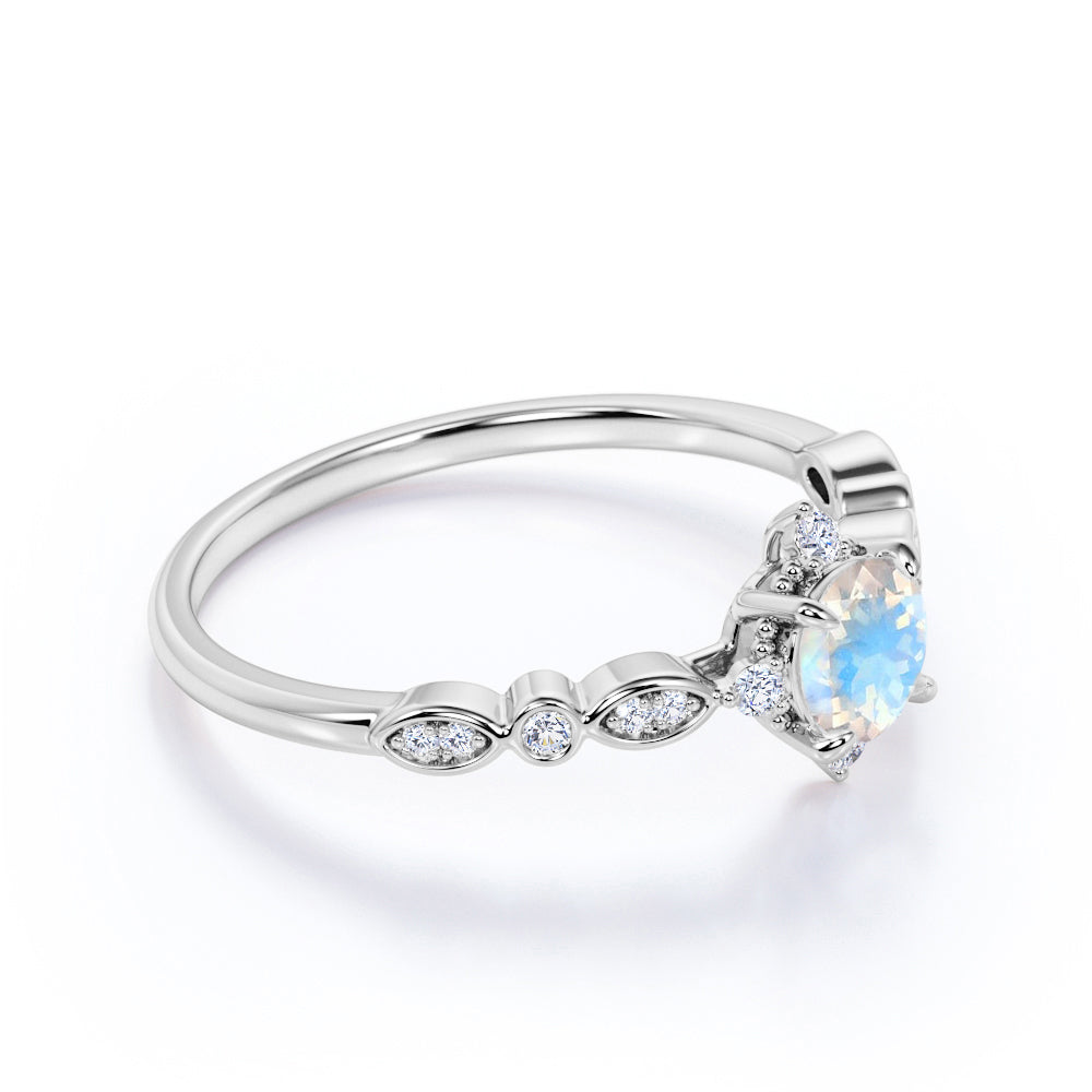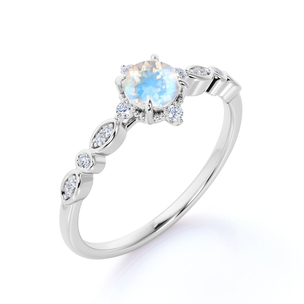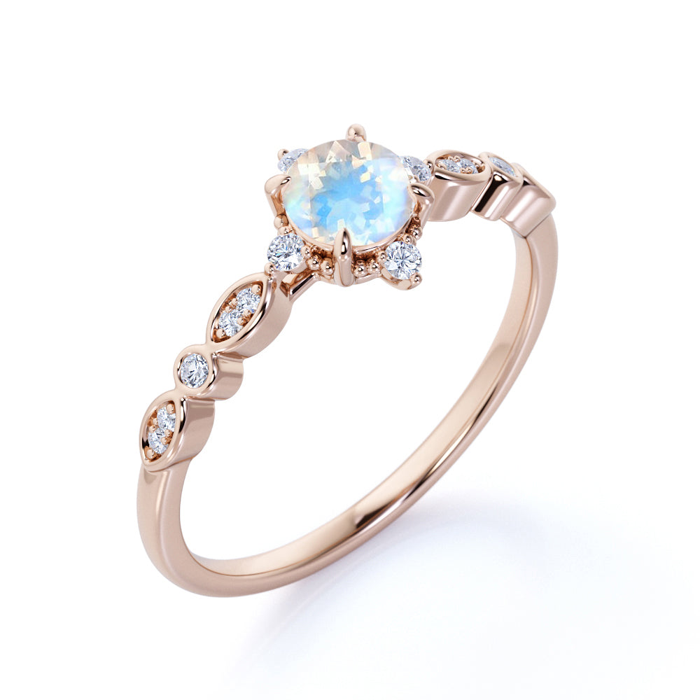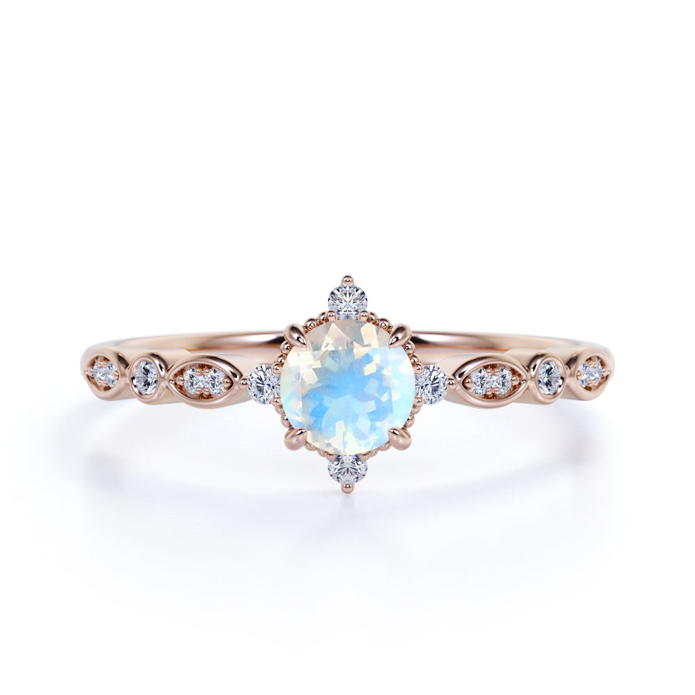 The colorful play of light from this faceted rainbow moonstone and diamond antique engagement ring will surely put a sparkle in your eyes. This five stone engagement ring features an approximately 6 mm round cut natural rainbow moonstone in the center of the engagement ring, surrounded by .25 carat real diamonds for gold ring and moissanite for silver ring, for a total weight of 1.50 carats.