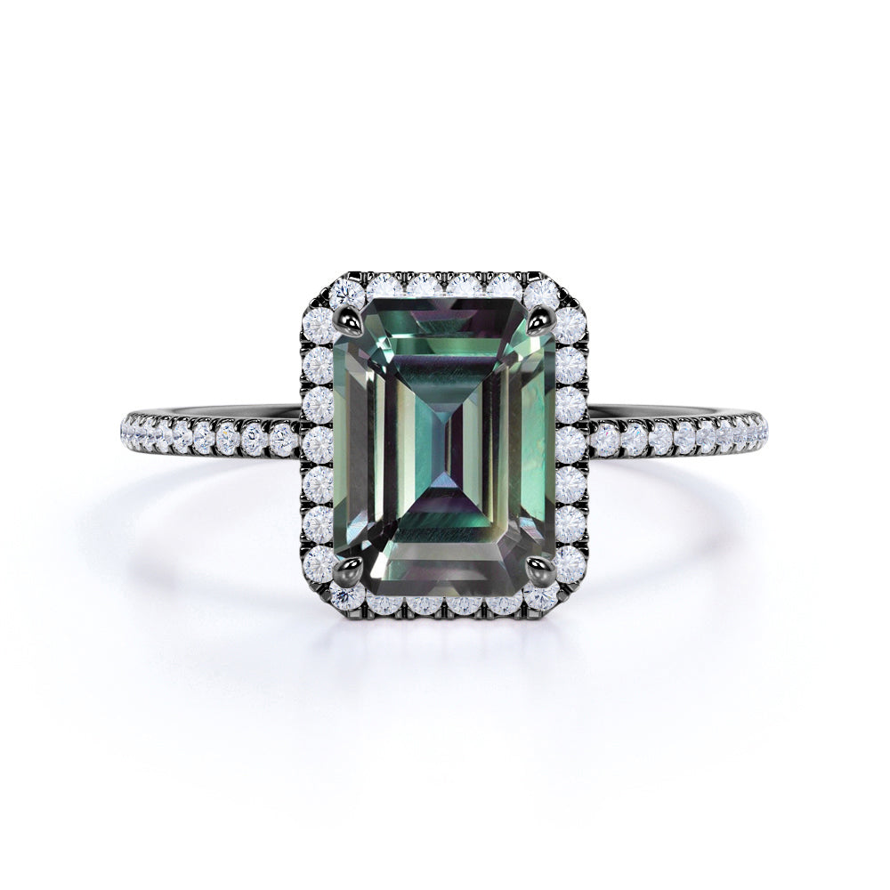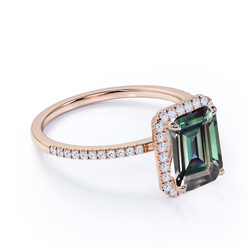 Flawless Halo 1.50 Carat Emerald Cut Lab Created Alexandrite and Diamond Pave Engagement Ring