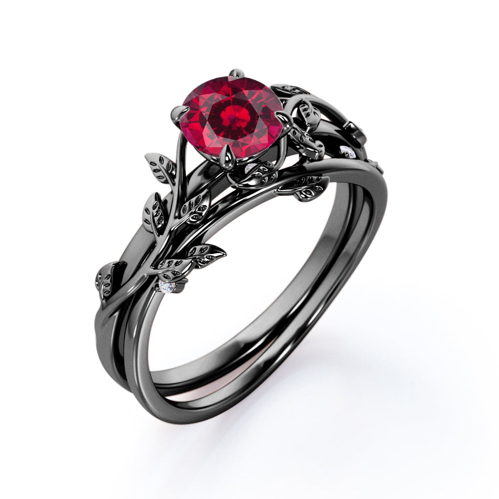 Experience the flawless beauty of our Nature Inspired 1 carat Round cut Lab-Created Ruby and Diamond Wedding ring set in White Gold. Meticulously handcrafted with precision and passion, this exquisite set is a true work of art. Featuring a radiant lab-created ruby center stone, elegantly surrounded by sparkling diamonds, this ring set captures the essence of natural beauty. With its intricate details and impeccable craftsmanship, it's the perfect symbol of everlasting love and commitment. Available in a variety of metal colors, including white gold, rose gold, yellow gold, and black gold in silver, 10k, and 14k gold variants, this set allows you to customize your jewelry to suit your personal style. Whether it's a wedding, anniversary, or special occasion, this stunning ring set is the ideal choice for celebrating love and creating unforgettable memories. Embrace the elegance and affordability of this extraordinary piece that will leave a lasting impression. Moreover, please note the side stones of this ring will change according to the metal variant chosen: the silver metal options are accompanied by sparkling moissanite side stones, while the 10k and 14k solid gold metals showcase dazzling diamond side stones.