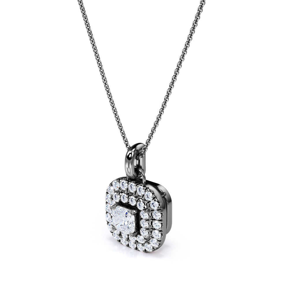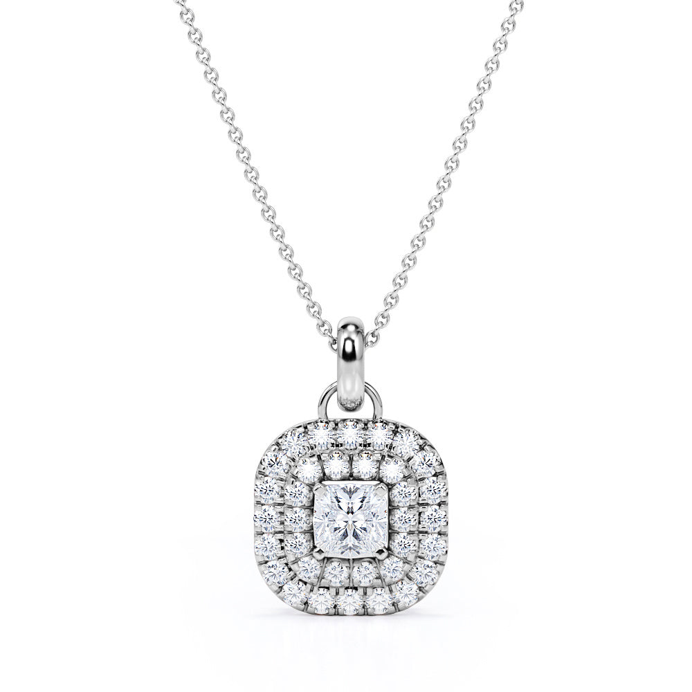 Floating Claw Set 1.50 Carat Princess Cut Certified Moissanite and Diamond Double Halo Single Bail Pendant Necklace in White Gold