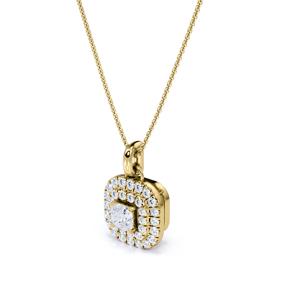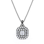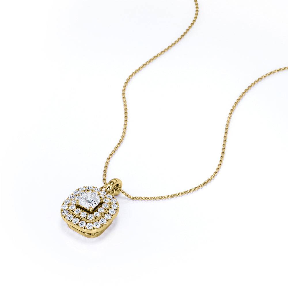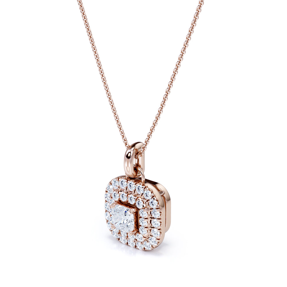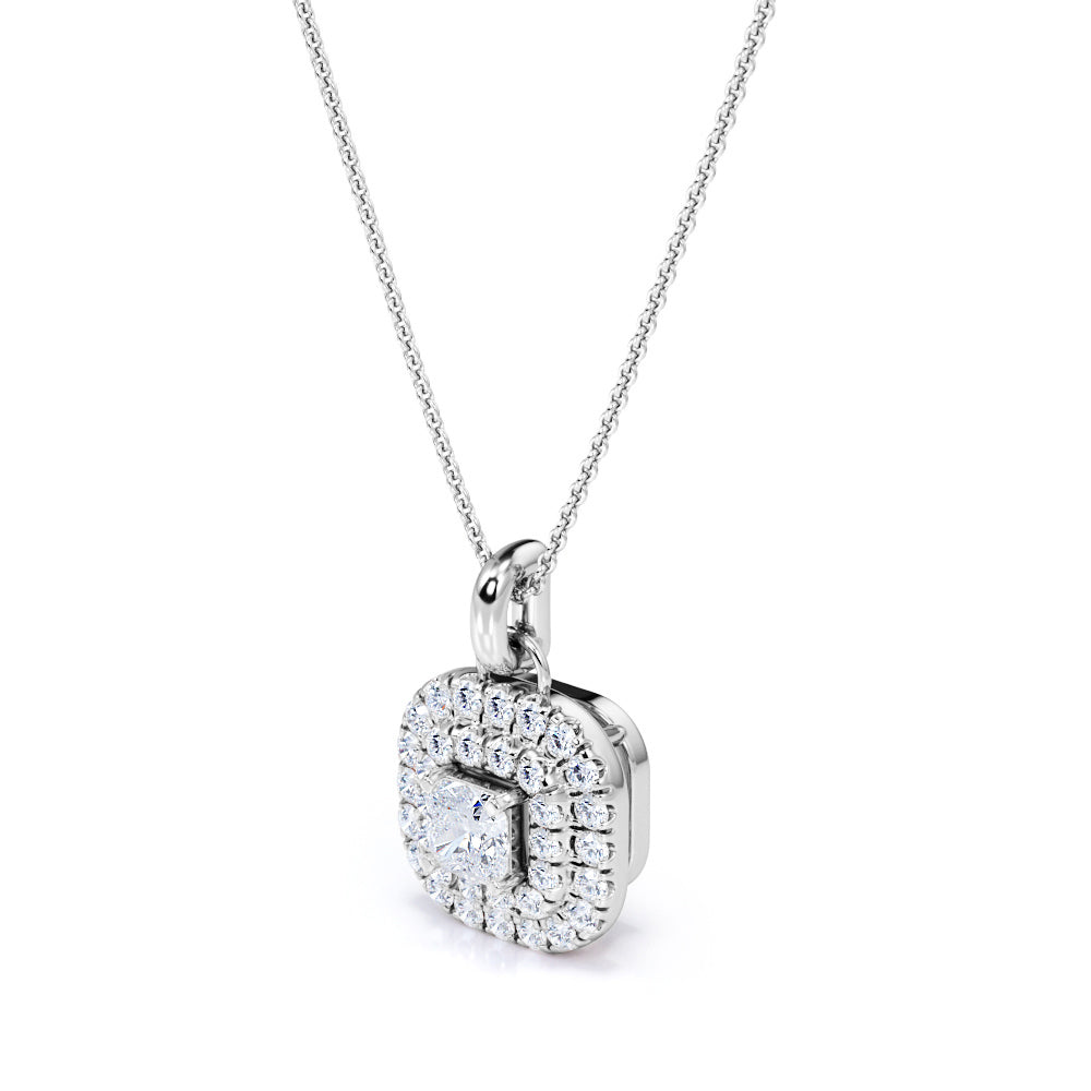Floating Claw Set 1.50 Carat Princess Cut Certified Moissanite and Diamond Double Halo Single Bail Pendant Necklace in White Gold