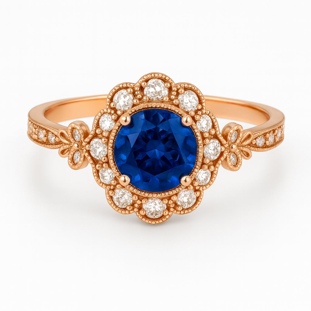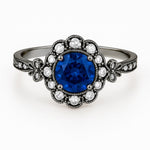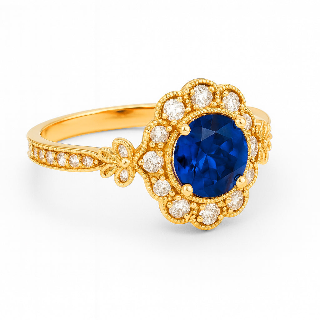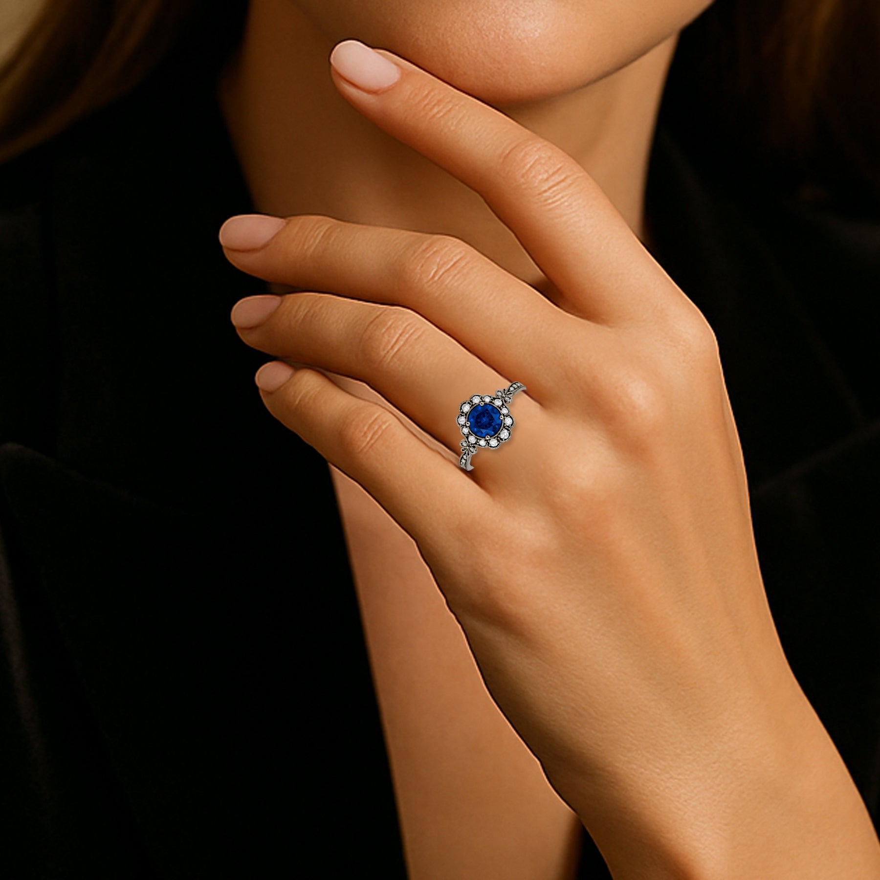 This enchanting ring carries a total carat weight of 1.30 Ct, designed with delicate floral beauty and timeless sparkle. At the center rests a 1 carat round cut blue sapphire, glowing with rich royal-blue hues that symbolize loyalty and elegance. Surrounding the sapphire is a dazzling halo of side stones, totaling 0.30 carats, which will be Moissanite for silver plated options and Diamond for solid gold, enhancing the brilliance of the design. With its floral-inspired halo and romantic detailing, this engagement ring is a graceful expression of love and sophistication.