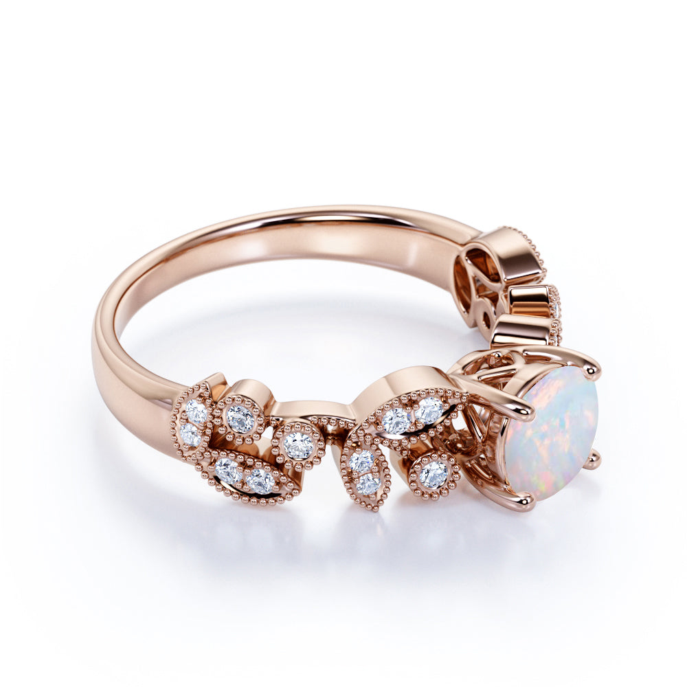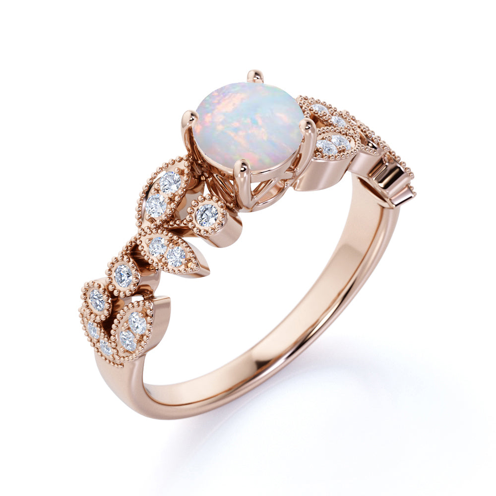Floral 1.50 Carat Round Galaxy Opal and Diamond Antique Leaf Engagement Ring in Rose Gold