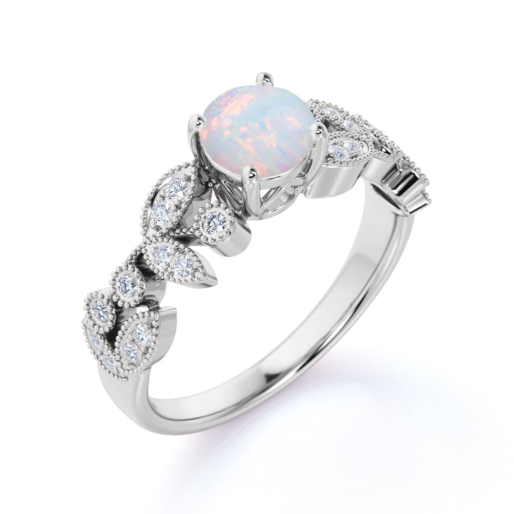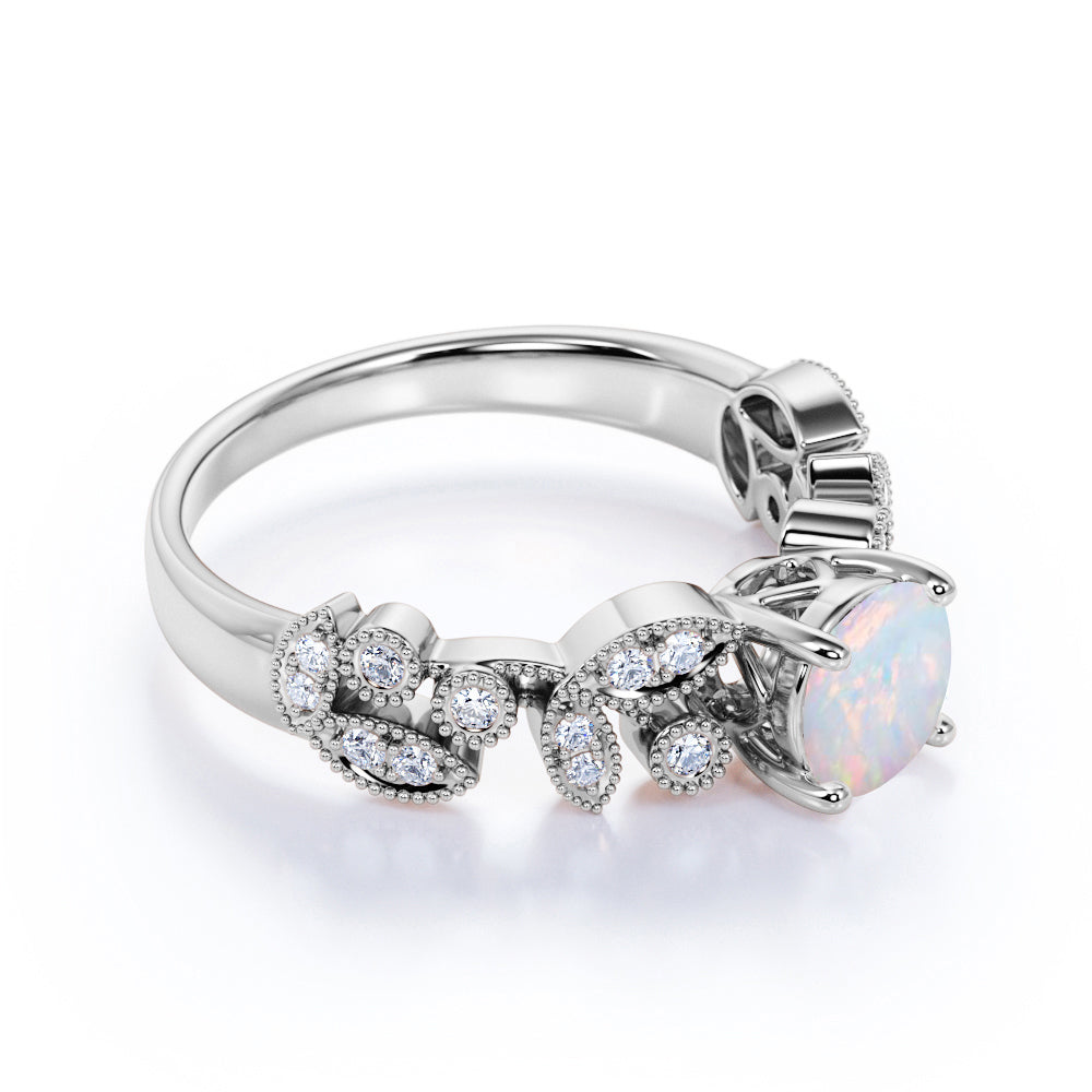 The antique style opal ring is very famous worldwide and this design is one of our bestselling. This opal is very unique since we can customized this to your preferred style or cut. Either in cushion, square, princess, pear, teardrop, round brilliant, oval, marquise, heart, trilliant, trillion, emerald, radiant, asscher or any other cut that you wish to receive. This opal ring features an approximately 1 carat round cut authentic opal, surrounded by .50 carat natural side diamonds for gold ring and moissanite for silver ring, for a total weight of 1.50 carats.