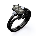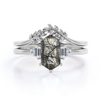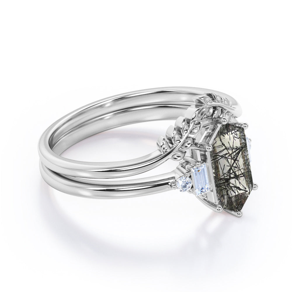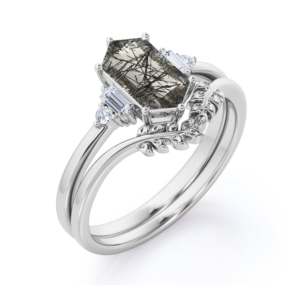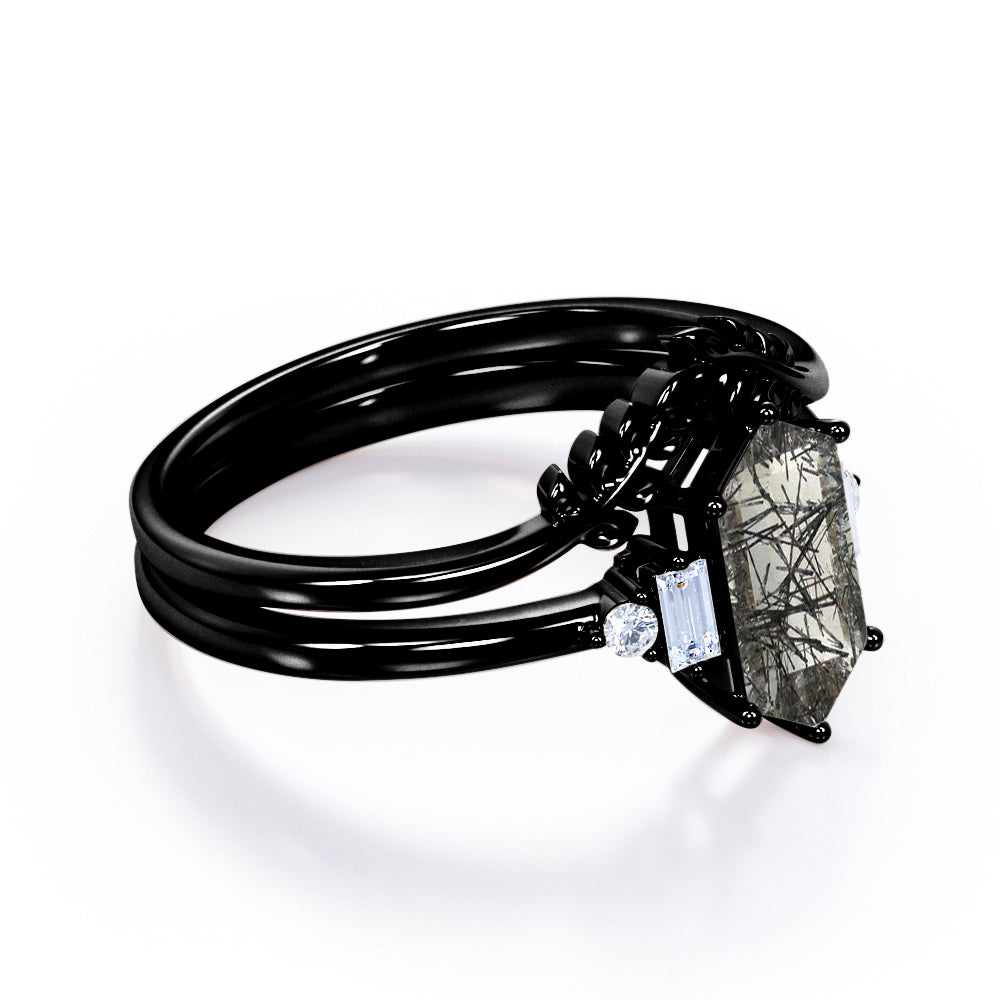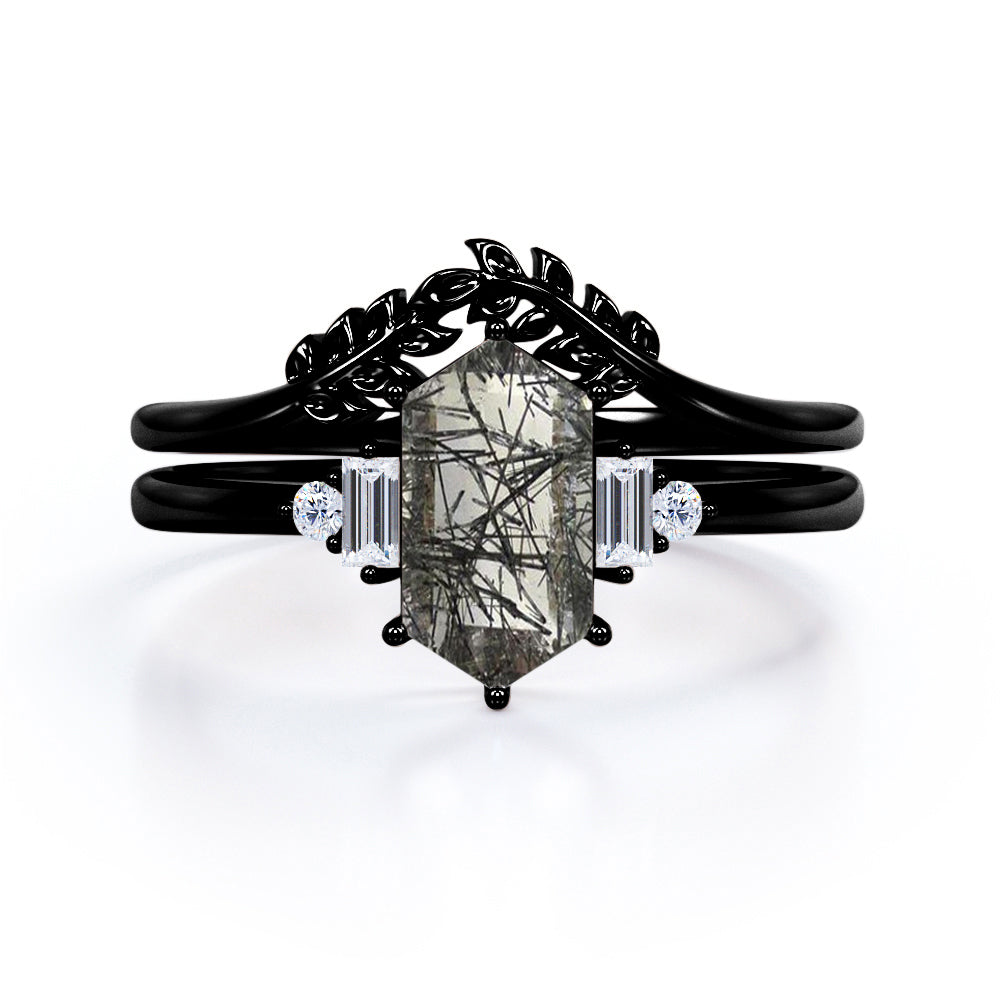 Floral Art Deco 1.15 Carat Hexagon Shaped Natural Black Rutilated Quartz And Diamond Nature Inspired Five Stone Wedding Ring Set In Black Gold. A floral art-deco design for all of the nature lovers out there. This asymmetrical wedding ring set features 1 carat hexagon shaped natural black rutilated quartz and mixed shapes and sizes of 0.15 carat white diamond side stones that surrounds the brilliant center stone and a floral vine art curved matching wedding band. The leaf design is so beautiful and the plain white gold band completes the look. With a simple band and no competing stones, all the attention is on the center stone. Since all of our products are handmade by our well- experienced craftsmen, this floral art deco 1.15 carat hexagon shaped natural black rutilated quartz and diamond nature inspired five stone wedding ring set in black gold can also be customized in 18k Gold plating over silver, 10k Gold or 14k Gold depending upon your choice. So what are you waiting for? Press add to your cart button now and make this alluring engagement ring all yours forever.