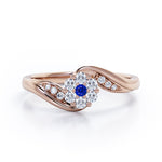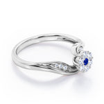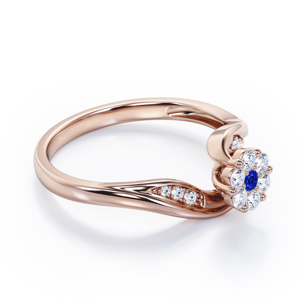 If she is not into a big gemstone, you can surprise her with this small stone ring, a Floral Cloud Clustered 0.55 carat Round Moissanite and Diamond Distorted Engagement Ring in White Gold. The ring is composed by petite round stones; round Blue Sapphire is placed among other small round Moissanite, forming into a dainty flower that you can give to your special one in their special occasion. What would be a better choice than giving them an eternal flower that will last with them forever. The band is curved and twisted with three Moissanite stones on each side. It comes at a very affordable price with 3 metal options; 18k gold over silver, 10k gold and 14k gold with the color of white gold, rose gold, yellow gold and black gold.