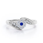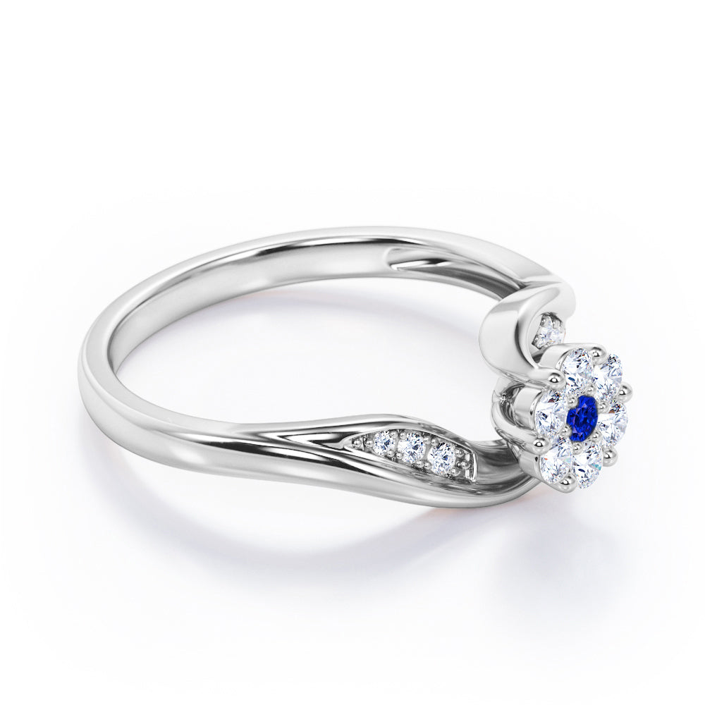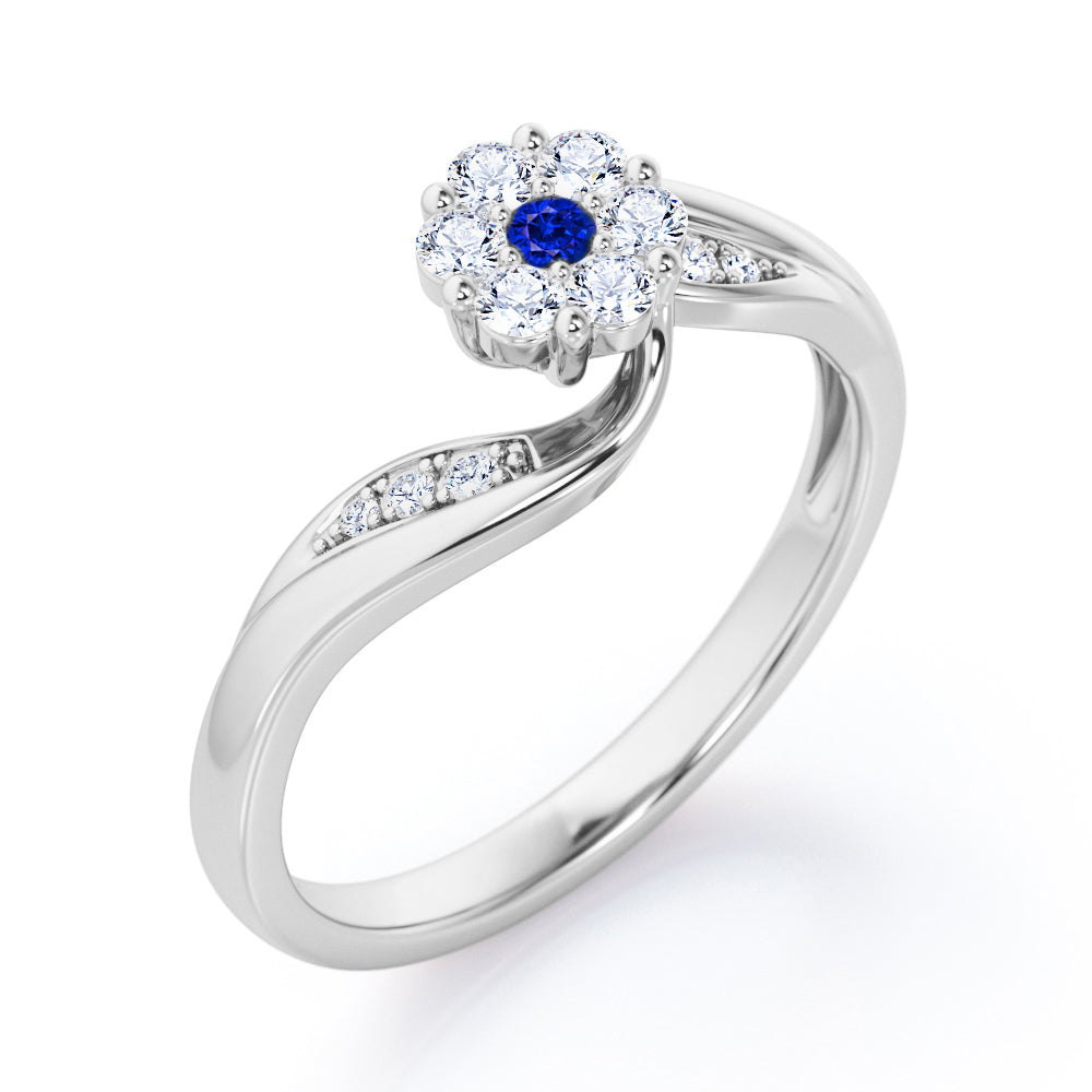Floral Cloud Clustered 0.55 carat Round Blue Sapphire and Moissanite Distorted Engagement Ring in White Gold