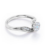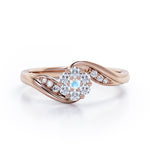 If she is not into a big gemstone, you can surprise her with this small stone ring, a Floral Cloud Clustered 0.55 carat Round Moissanite and Diamond Distorted Engagement Ring in White Gold. The ring is composed by petite round stones; round Moonstone is placed among other small round Moissanite, forming into a dainty flower that you can give to your special one in their special occasion. What would be a better choice than giving them an eternal flower that will last with them forever. The band is curved and twisted with three Moissanite stones on each side. It comes at a very affordable price with 3 metal options; 18k gold over silver, 10k gold and 14k gold with the color of white gold, rose gold, yellow gold and black gold.