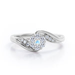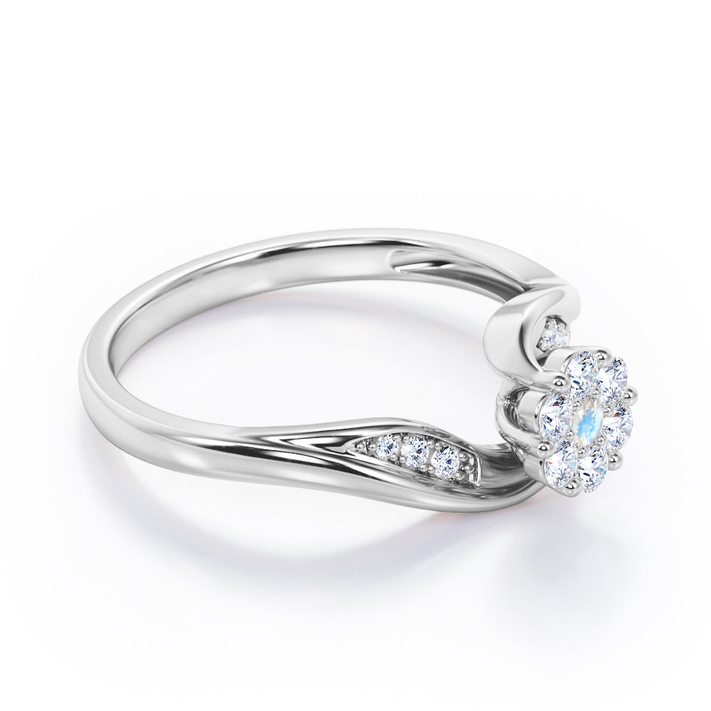 Floral Cloud Clustered 0.55 carat Round Moonstone and Moissanite Distorted Engagement Ring in White Gold