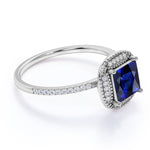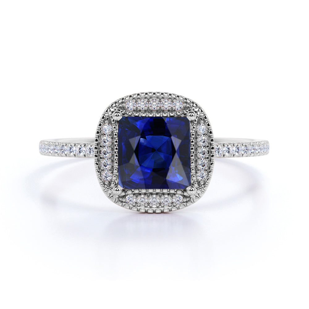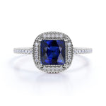 This is a floral design 1.25 Carat Cushion Cut Sapphire and Diamond Halo Engagement Ring in White Gold. The engagement ring is made with natural sapphire, real diamonds and on real gold. The sapphire engagement ring can be made in either Rose, White or Yellow Gold, and can be customized to your choice of 10k, 14k or 18k Gold. As always, the order comes with jewelry certificate, 6 month limited warranty and 30 days full refund policy. Although each ring is handmade and customized to your specifications, we guarantee that once you placed your order, we will make and deliver it to you within 5 business days.