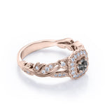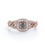 IMPORTANT NOTE: SINCE WE USE NATURAL SALT & PEPPER DIAMOND, EACH STONE WILL BE UNIQUE AND DIFFERENT IN TERMS OF COLORS AND INCLUSIONS. PLEASE BE INFORMED THAT THE CENTER STONE MAY NOT LOOK EXACTLY THE SAME AS IN THE ADVERTISED PICTURES. Be sure to please her with this Floral Frame 1 Carat Round Cut Natural Salt and Pepper Diamond Art Deco Engagement Ring in 18K Rose Gold over Silver. This art deco engagement ring features a .50 carat round cut natural salt and pepper diamond in the center and .50 carat round cut moissanite side stones. The highlights of this ring are the square frame and the beautiful floral design. The ring can also be customized to 18k White Gold, Rose Gold or Yellow Gold plating over silver as per your selection. Also, as your satisfaction is our most priority, we will do our best to have your handmade jewelry be carefully and beautifully crafted by our expert jewelers. The order also comes with an elegant jewelry ring box and with 30 days full refund policy. Unlike other gemstones, not a single salt and pepper diamond will look the same with another. This adds to why it's a very popular gemstone. If you don't go by the book, this wild looking gemstone is absolutely made for you.