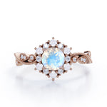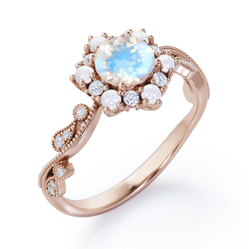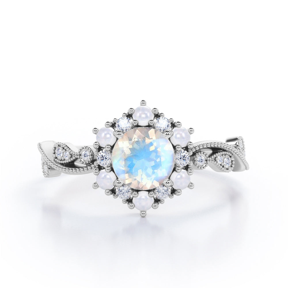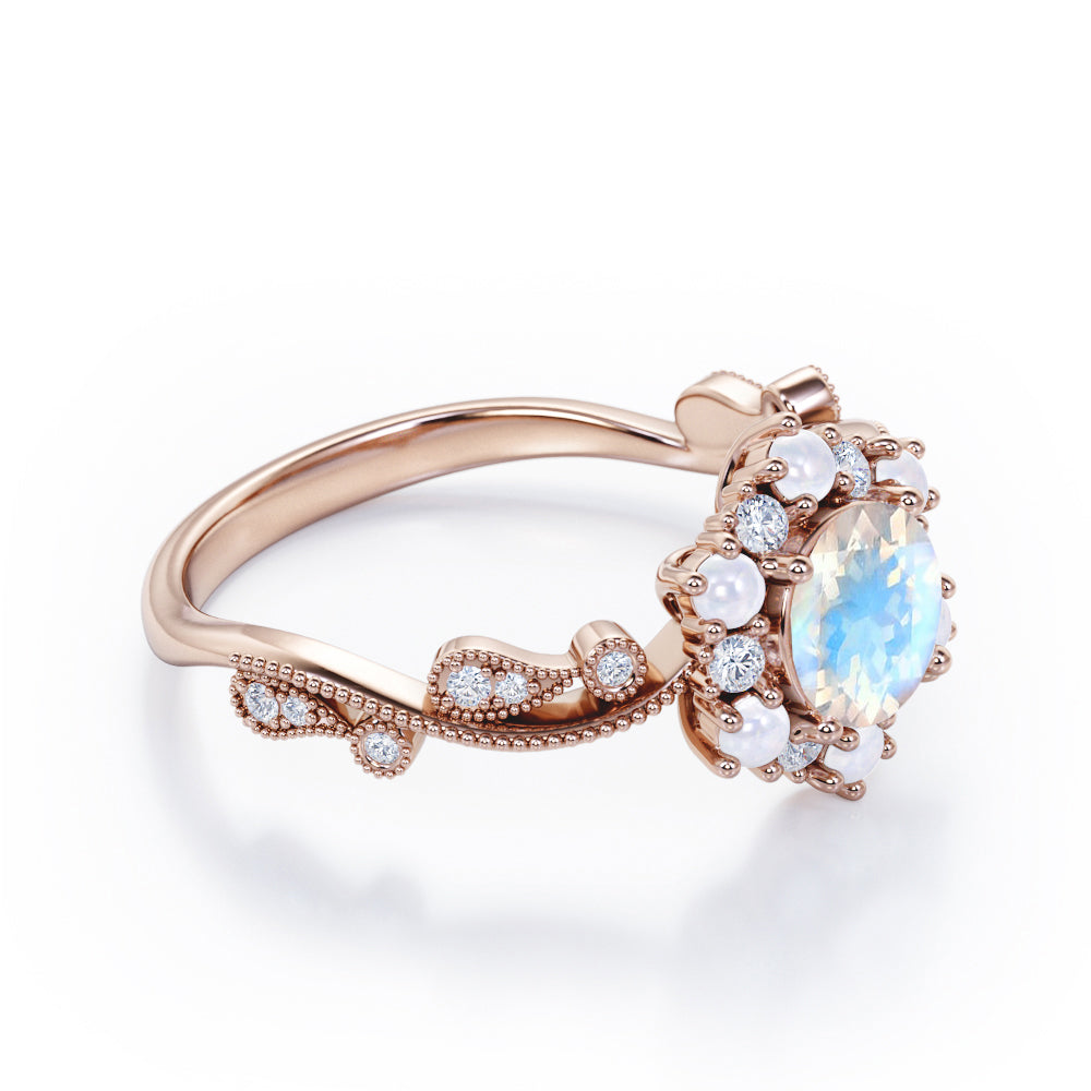 Captivate your sunshine with the Floral Halo 0.7 carat Round Moonstone and Diamond Engagement Ring in White Gold. The promise ring displays a 0.5 carat round Moonstone and surrounded by round pearl and dainty round diamonds. An alternating stones accent signifies small petals of the flower. The band is curved and garnished with waterdrop and round shape like a leaf after the rainy day; each shape also houses round petite diamond inside. This vintage ring can be made in 18k gold over silver, 10k gold and 14k gold with the color of white gold, rose gold, yellow gold and black gold.