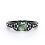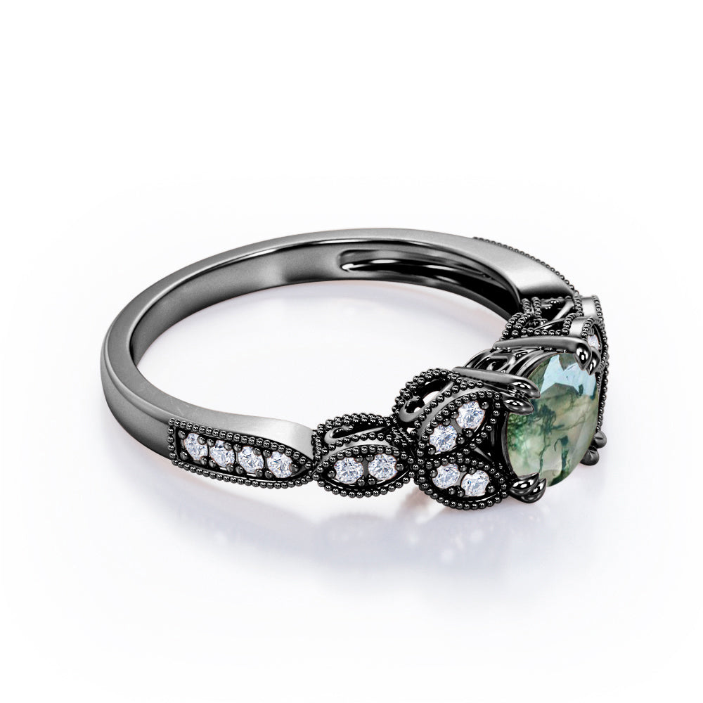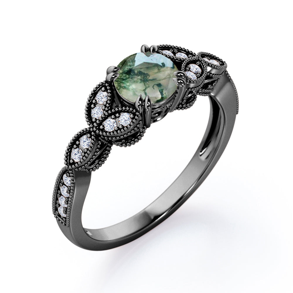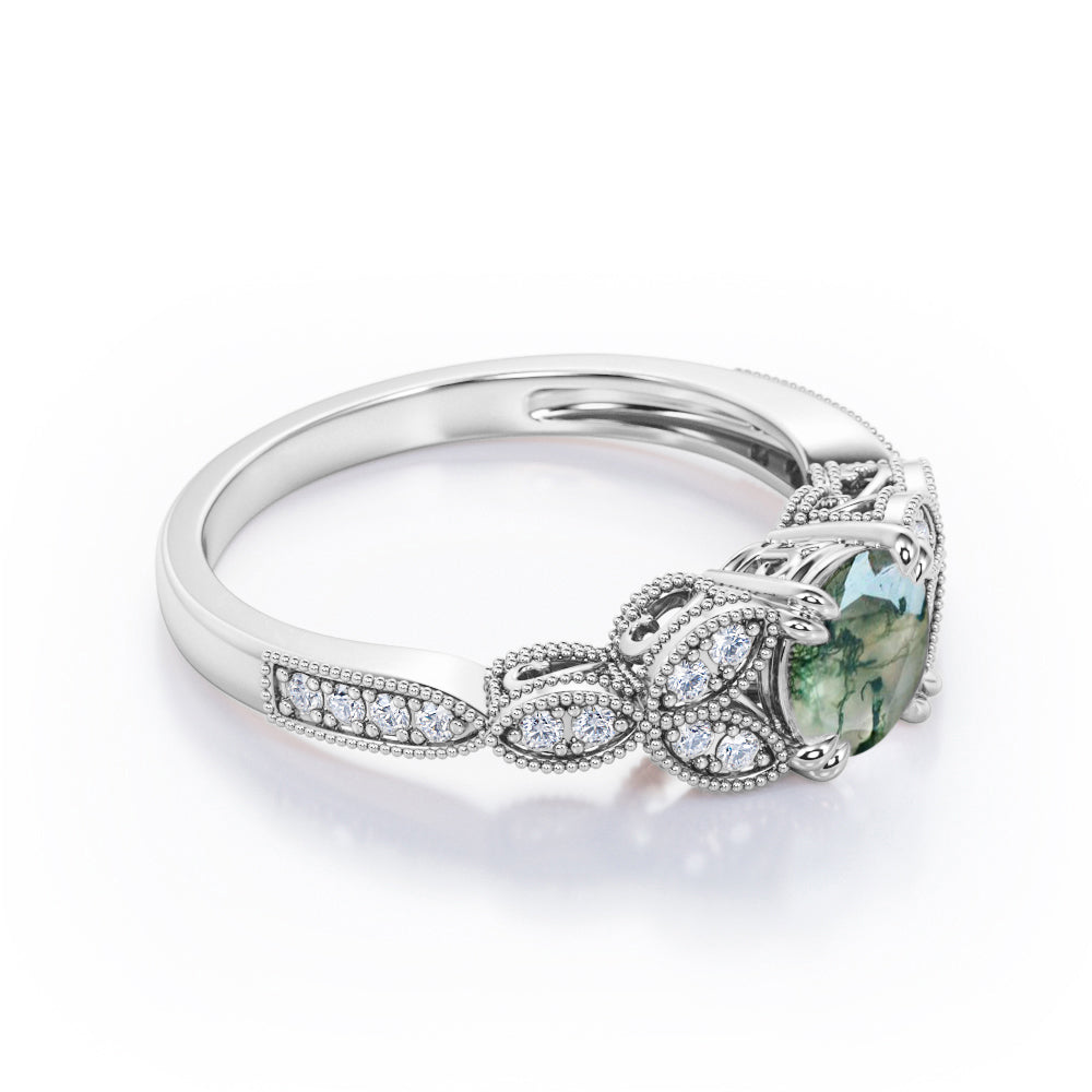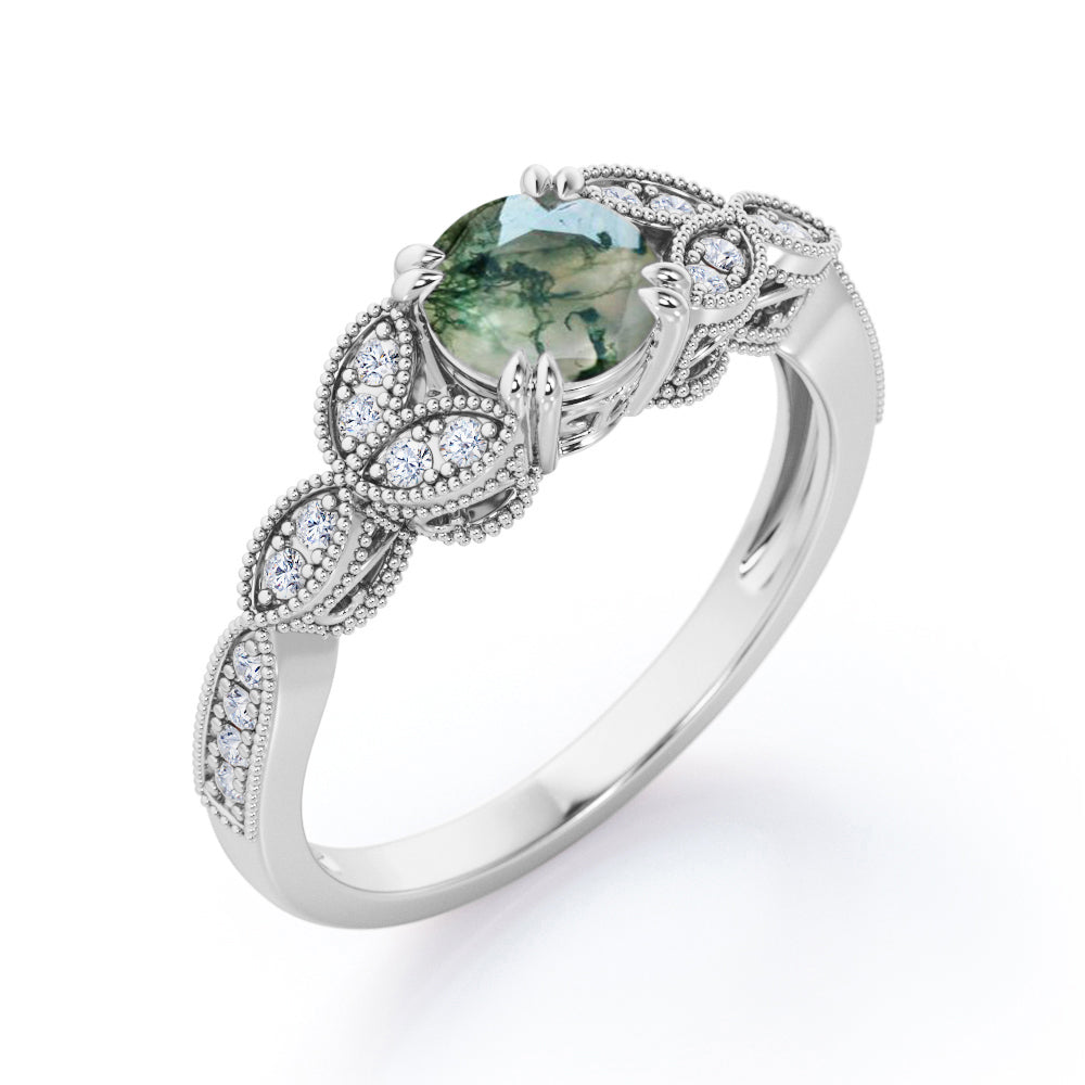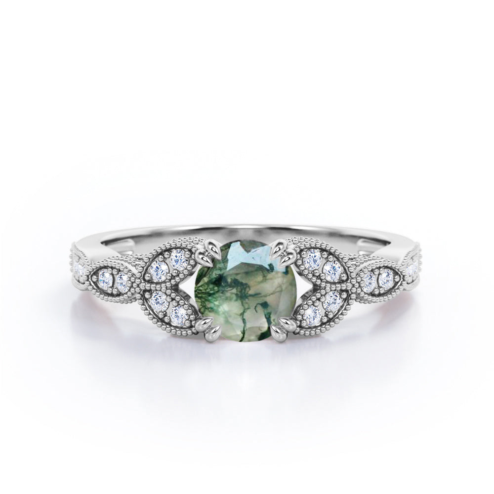 Floral Pattern 1.35 Carat Round Cut Green Moss Agate And Diamond Beaded Art Deco Engagement Ring In white Gold. Complete your vows with this art deco style ring and make your love story as antique as this engagement ring is. The floral pattern and vintage milgrain style adds a certain loveliness to the ring. Choosing the right wedding ring is very important as it will express your love and stir feelings of joy that will be unforgettable. Choose this round cut green moss agate ring and enter into a new journey of your life. Handmade with sincere love and devotion, this floral pattern 1.35 carat round cut green moss agate and diamond beaded art deco engagement ring in white gold can also be customized to 18k gold plating over silver, 10k Gold or 14k Gold as per your preference. Both breathtaking and timeless, this piece exudes effortless beauty. Please note that if the ring is made over silver, the side stone will be moissanite and if it is made on gold, diamond will be employed as the side stone.