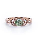 Floral Pattern 1.35 Carat Round Cut Green Moss Agate And Diamond Beaded Art Deco Engagement Ring In White Gold
