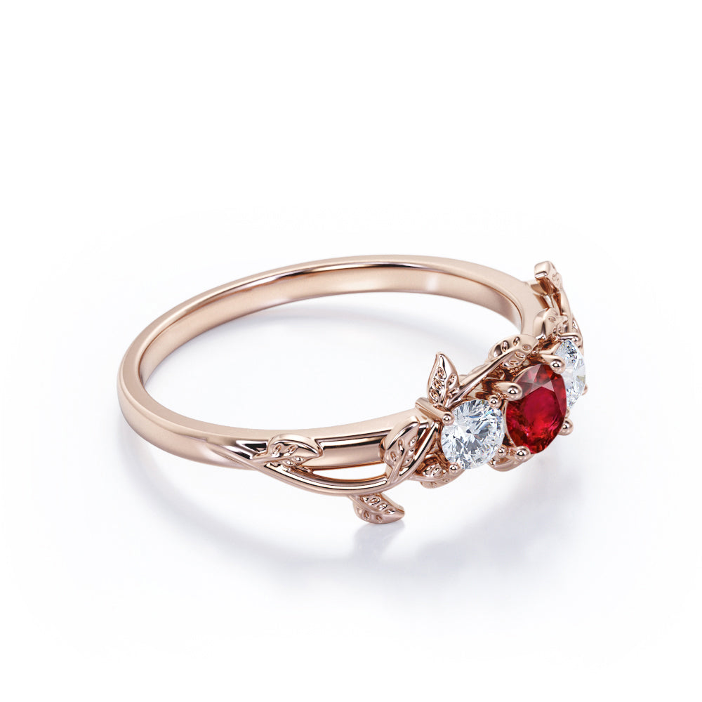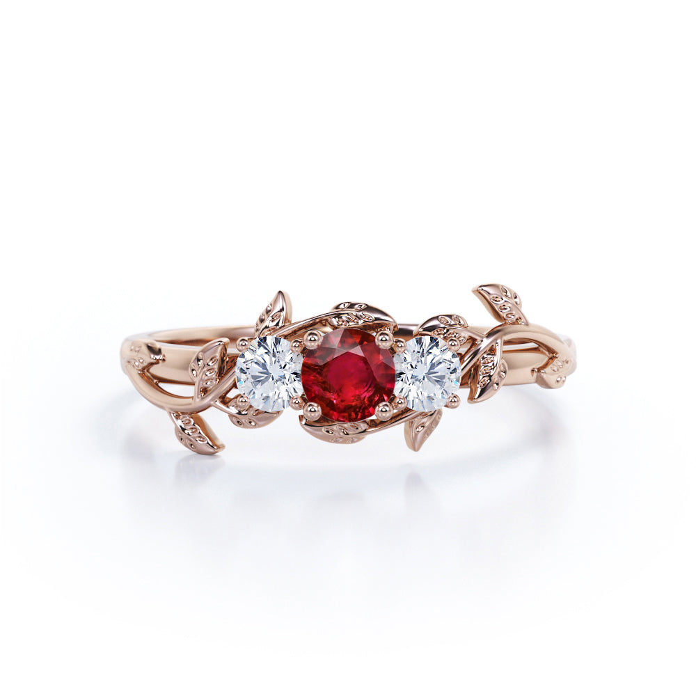 Floral Three-Stone 0.70 ct Round Lab-Created Ruby Engagement Ring