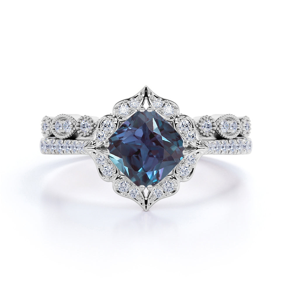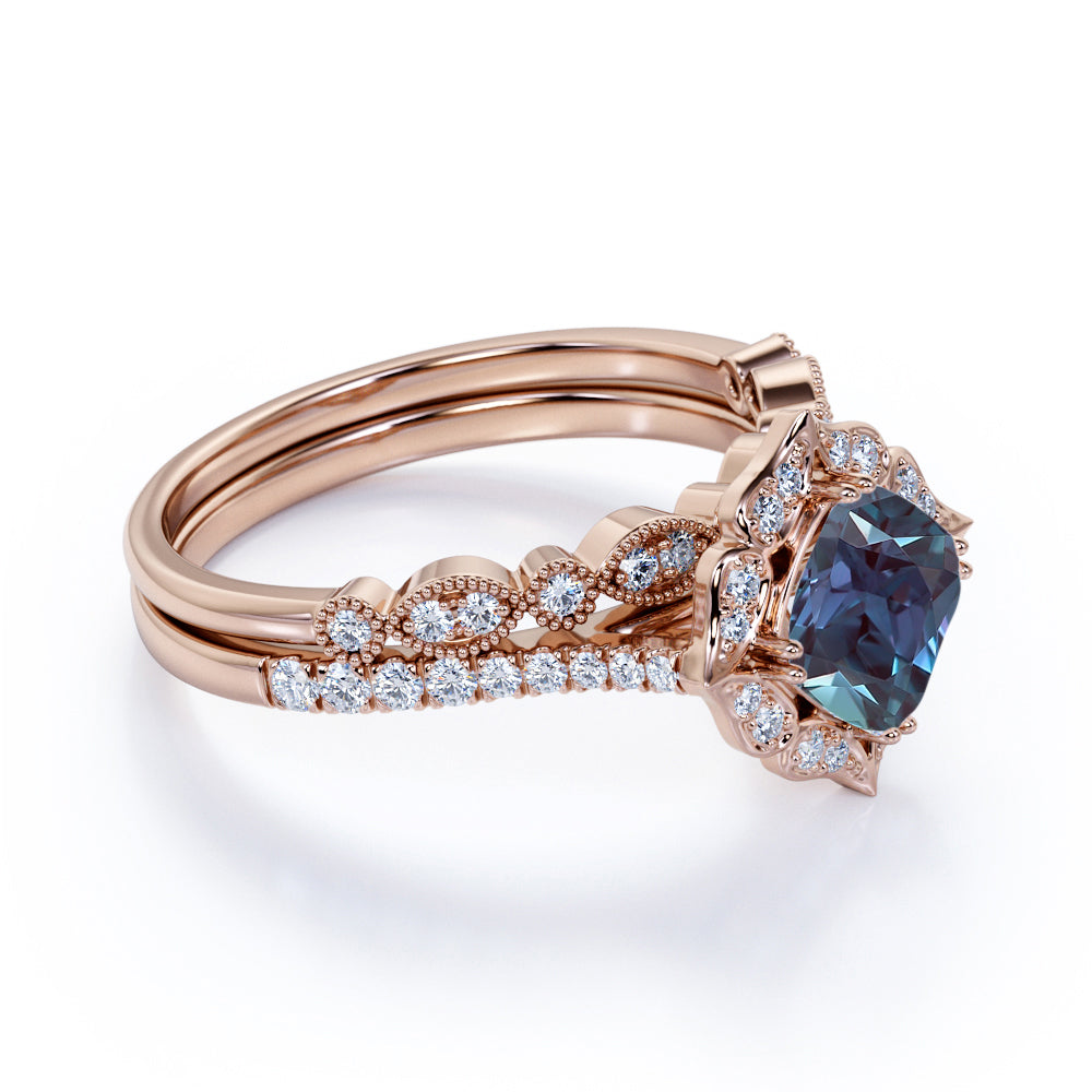 Flower Bezel Set 1.75 Carat Cushion Cut Simulated Alexandrite and Diamond Art Deco Bridal Set Rings