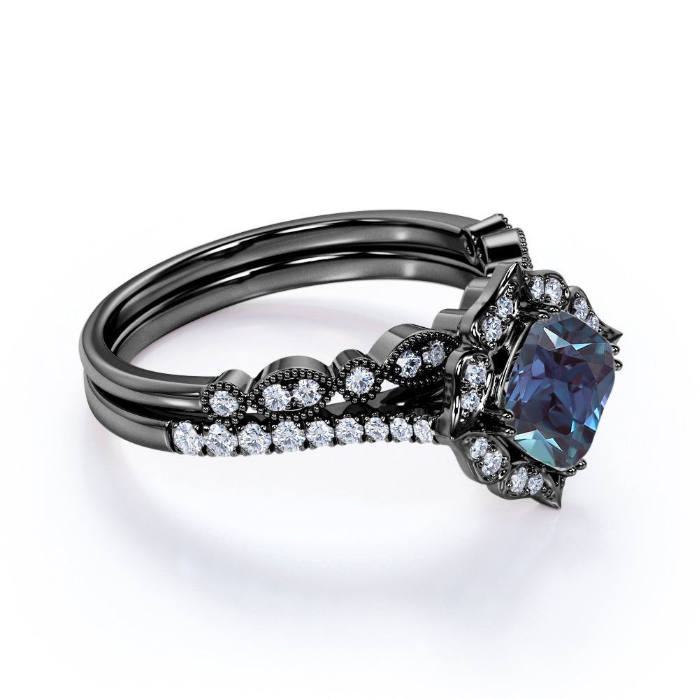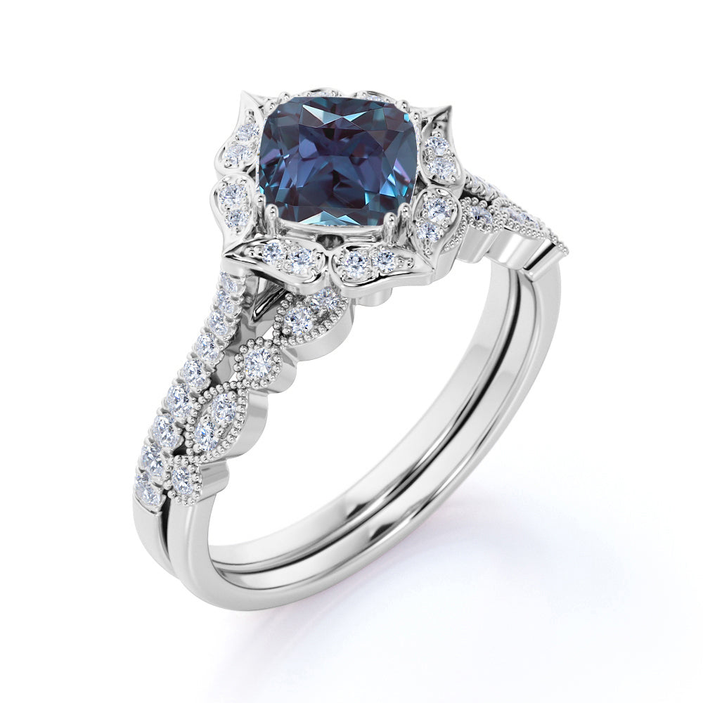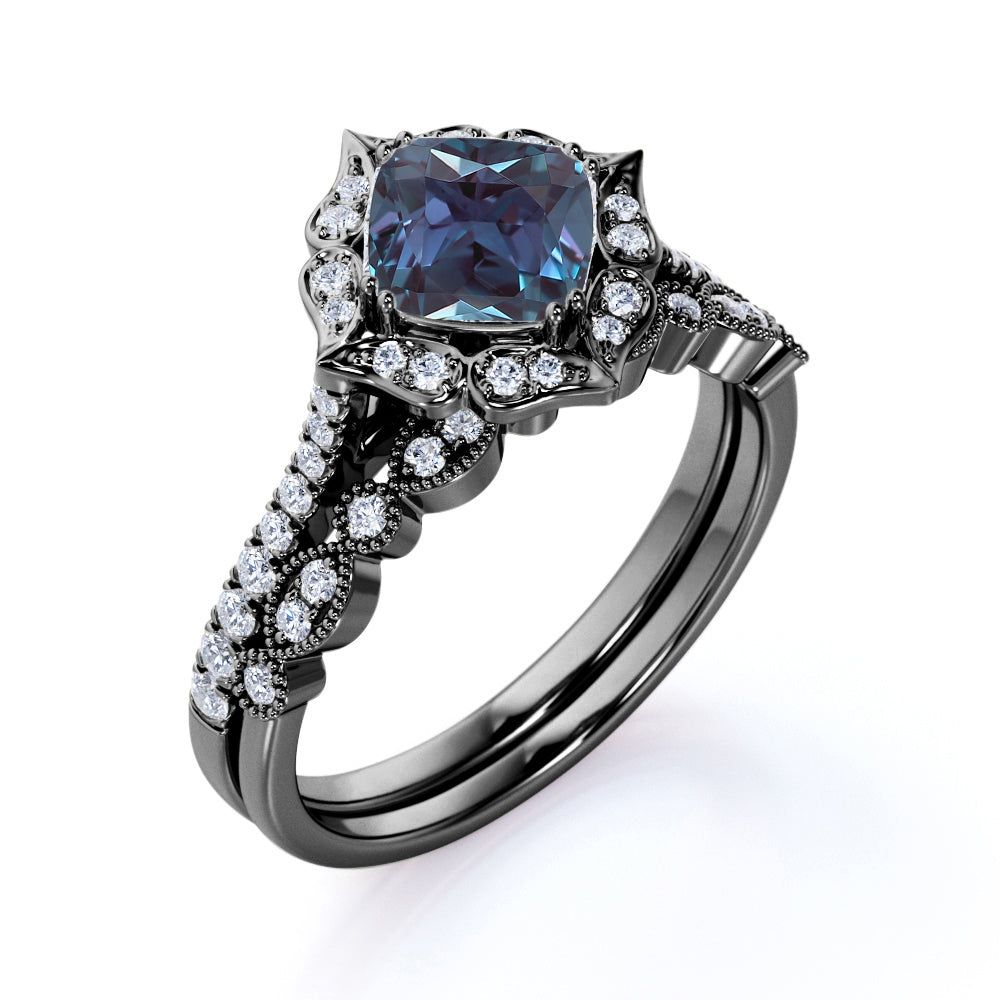 Be on cloud nine with this Flower Bezel Set 1.75 Carat Cushion Cut Simulated Alexandrite and Diamond Art Deco Bridal Set Rings. This nature style rings feature 1 carat cushion cut lab grown Alexandrite and .75 carat real genuine side diamond for gold ring and moissanite for silver ring. This unique wedding ring sets can be customized to either 10k, 14K and Gold over Silver and either Black Gold, Rose Gold, White Gold or Yellow Gold. Also, as your satisfaction is our most priority, we will do our best to have your handmade jewelry be carefully and beautifully crafted by our expert jewelers. The order also comes with a 30-day full refund policy. Crowned as June birthstone, this flawless synthetic Alexandrite ring will bring hope as well as encouragement to you. Being one of the rarest gemstones in the world, this ring will create a charming and fascinating look on your fingers. This flawless ring will be a perfect fit for you love story as it is believed that joy enters the lives of people through the stone. If you are searching for some alternate gemstone, this Friday's stone ring will be your right choice. Own this ring which displays one of the most remarkable color changes and stand out from the rest. Embellish your love story with this beautiful man made Alexandrite ring and make it even more memorable. This ring will surely complement every style of its wearer. Design and create your very own unique ring that makes you outstanding from the rest! Those who has a penchant for vintage and flawless ring would completely fall in love with this affordable synthetic Alexandrite ring. It is the perfect match for those who are looking for a remarkable gemstone rings as Alexandrite embodies their own unique color-change ability and uplifting meaning.