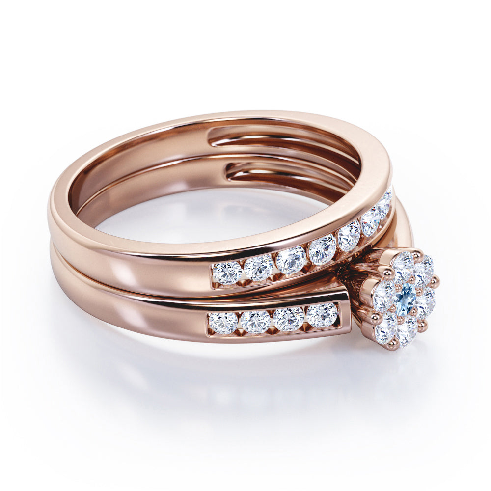 Flower Cluster Design 0.5 TCW Round-Shaped Aquamarine and Moissanite Flush-Channel Bridal Ring Set in White Gold