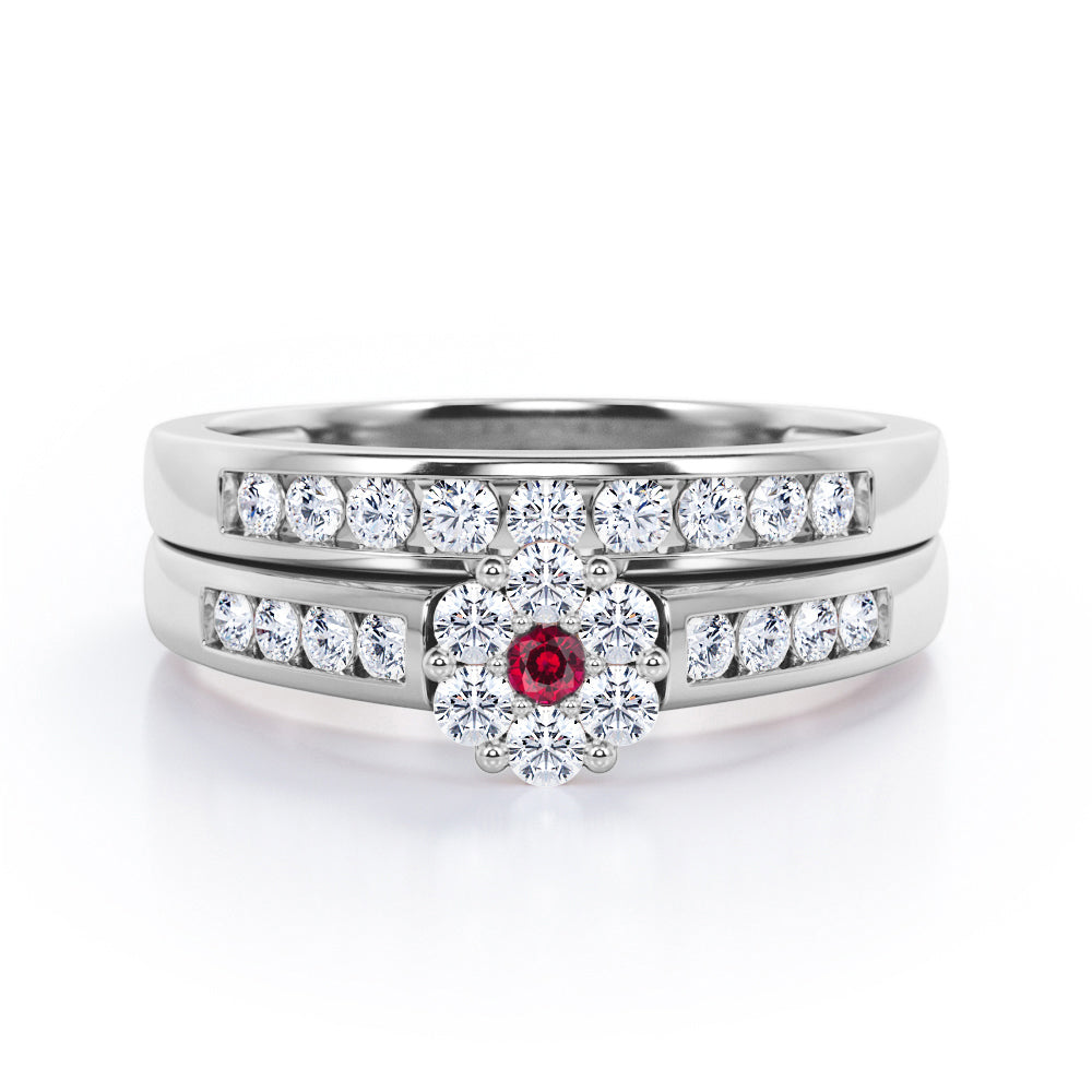 Flower Cluster Design 0.5 TCW Round-Shaped Ruby and Moissanite Flush-Channel Bridal Ring Set in Rose Gold