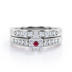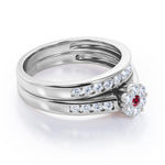 A beautiful design for your beloved one. Flower Cluster Design 0.5 TCW Round-Shaped Moissanite and Diamond Flush-Channel Bridal Ring Set in Rose Gold. The engagement ring displays 7 stones round Ruby and Moissanite that are formed into a petite flower while the rest of the band features eight stones in a channel setting ; 4 stones on each side. Comes with the promise ring is a wedding band that hold the same design with the Moissanite ring. Your loved one can either wear the rings together or separately to match with different attires. Both rings can be customized to 18k gold over silver, 10k gold and 14k gold with the color of white gold, rose gold, yellow gold and black gold.