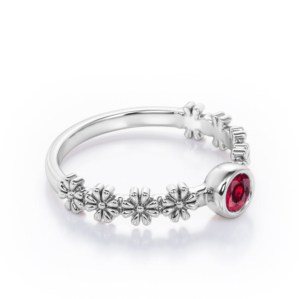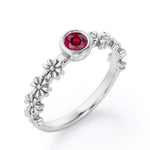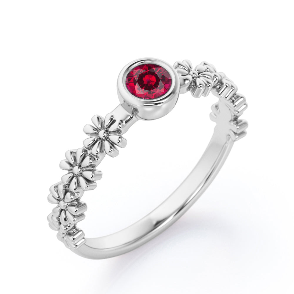 A striking 0.5 carat Lab Ruby is placed in bezel setting on a Flower Field 0.5 carat Round Lab Ruby Solitaire Nature-Inspired ring in Rose Gold. The band is garnished with 8 dainty crafted dainty flowers; with 4 pieces on each side. The band may seem simple but it will sure look lovely once it is worn. If your beloved one loves and adores cute rings, you should surely get this for them. The ring can be customized in 18k gold over silver, 10k gold or 14k gold with the color of white gold, rose gold, yellow gold and black gold.