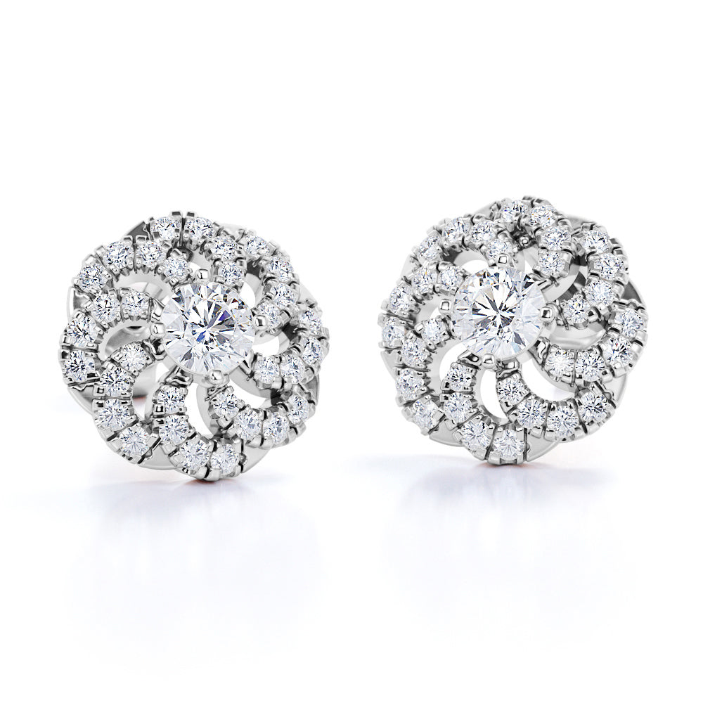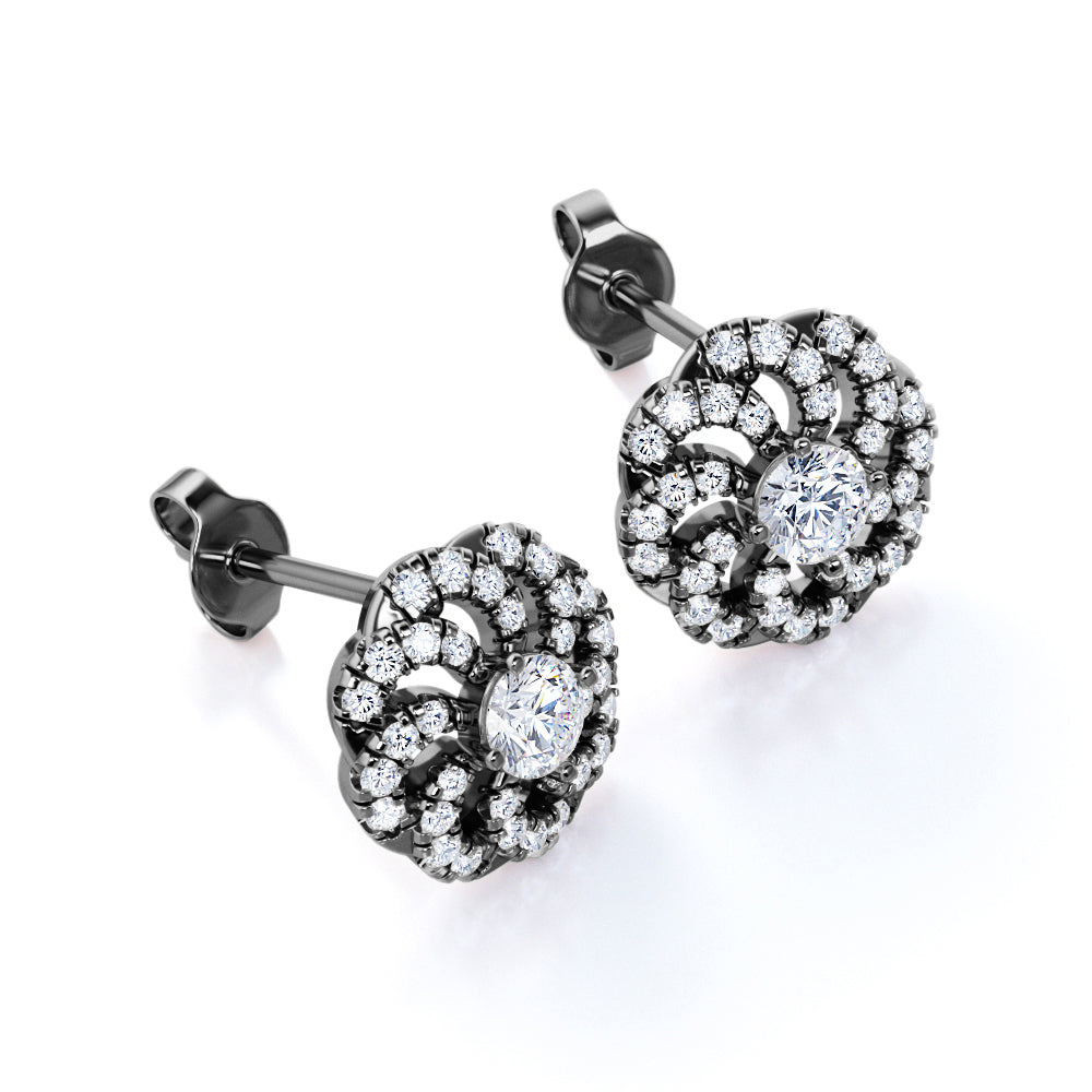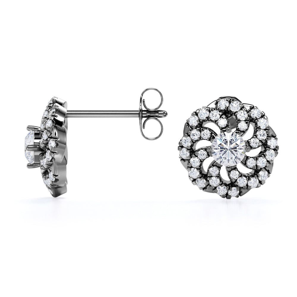 Flower Floating 1.25 Carat Round Certified Moissanite and Diamond French Pave Stud Earrings in Black Gold