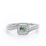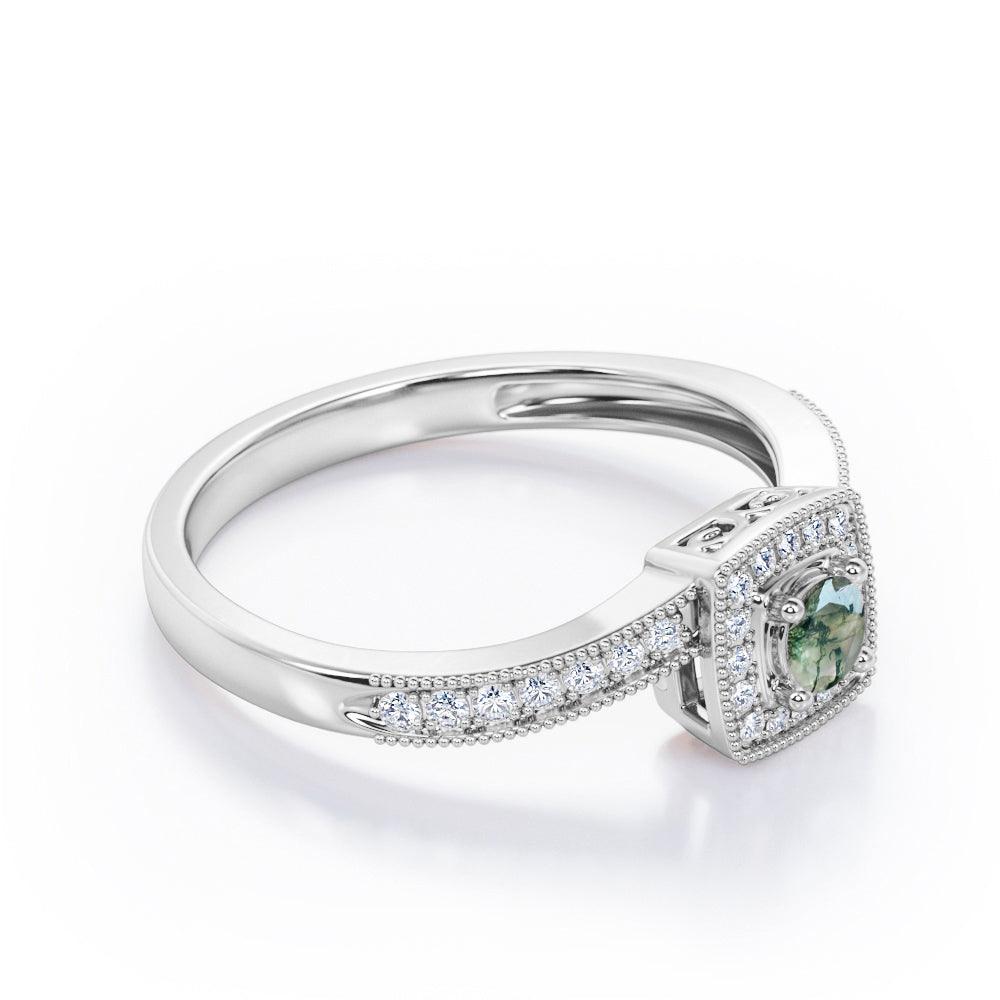Flush-Prong Halo 1.25 Carat Round Cut Green Moss Agate and diamond Milgrain-Edged Pave Channel Engagement Ring in White Gold