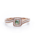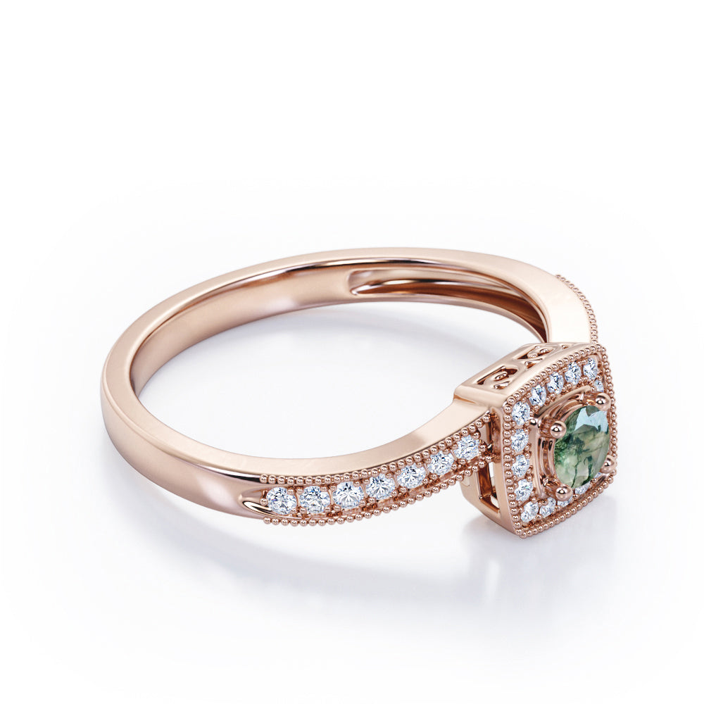 With this Flush-Prong Halo 1.25 Carat Round Cut Green Moss Agate and diamond Milgrain-Edged Pave Channel Engagement Ring in White Gold, you can begin the most romantic chapter of your life. Handcrafted with care into a wonderful round cut by our most talented jewelers, this beautiful Green Moss Agate ring for women consists of a 1 carat round cut Moss Agate in the center and is enhanced with diamond sparkling side stones. For those looking for something a little out of the ordinary, this cheap real Green Moss Agate ring is an excellent choice. Known for its healing properties, this gem engagement ring is magnificent with its moss like inclusions will be an unmistakable addition to any jewelry collection. This cheap Green Moss Agate engagement ring is stunning and inexpensive, thanks to its reasonable price. If you are looking for a Green Moss Agate ring for any special event, such as a birthday, an engagement, or a marriage proposal, this cheap wedding ring a great choice. Additionally, this Green Moss Agate ring for women can be customized, either in rose gold, white gold, black gold, or yellow gold, upon customer request. Let's show her how much you care by giving her this affordable Green Moss Agate ring, and she will never regret it.