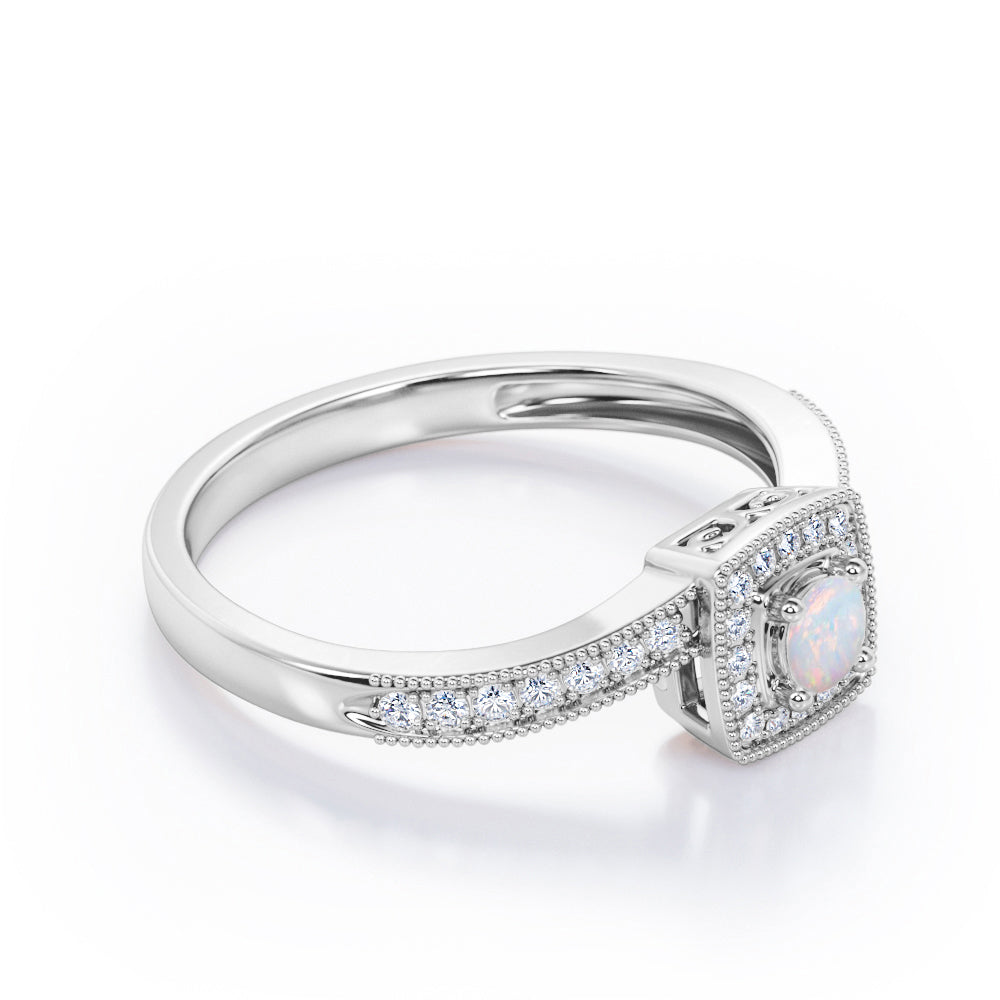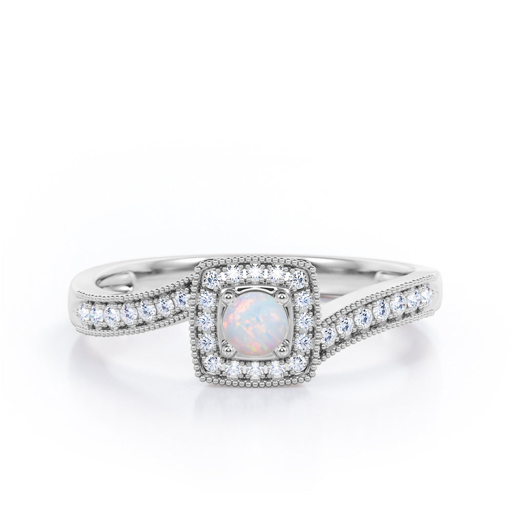 Flush-Prong Halo 1.25 Carat Round Cut Opal and diamond Milgrain-Edged Pave Channel Engagement Ring in White Gold