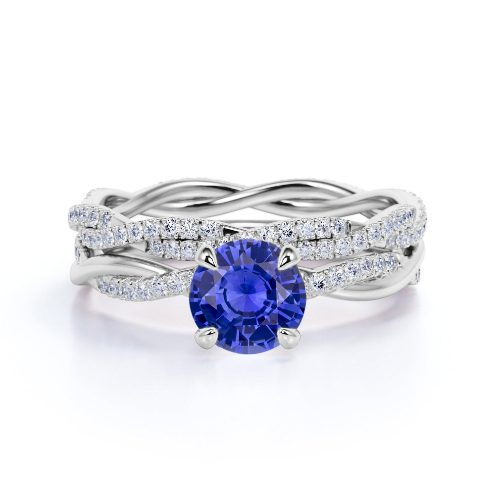This is a beautiful twisted four claw 1.75 Carat Round Cut Lab-Created Sapphire and Diamond Wedding Set with Infinity Band in White Gold. The four prong design wedding set features 1 carat round cut Lab-Created Sapphire in the center, surrounded with 0.75 carat of diamonds, for a total carat weight of 1.75 Carats. The Lab-Created sapphire wedding set can be made in either Rose, White, Black or Yellow Gold, and can be customized to your choice of 10k, 14k solid gold or 18k Gold over Silver. As always, the order comes with jewelry certificate, 6 month limited warranty and 30 days full refund policy. We also guarantee that once you placed your order, we will make and deliver it to you within 2 weeks.