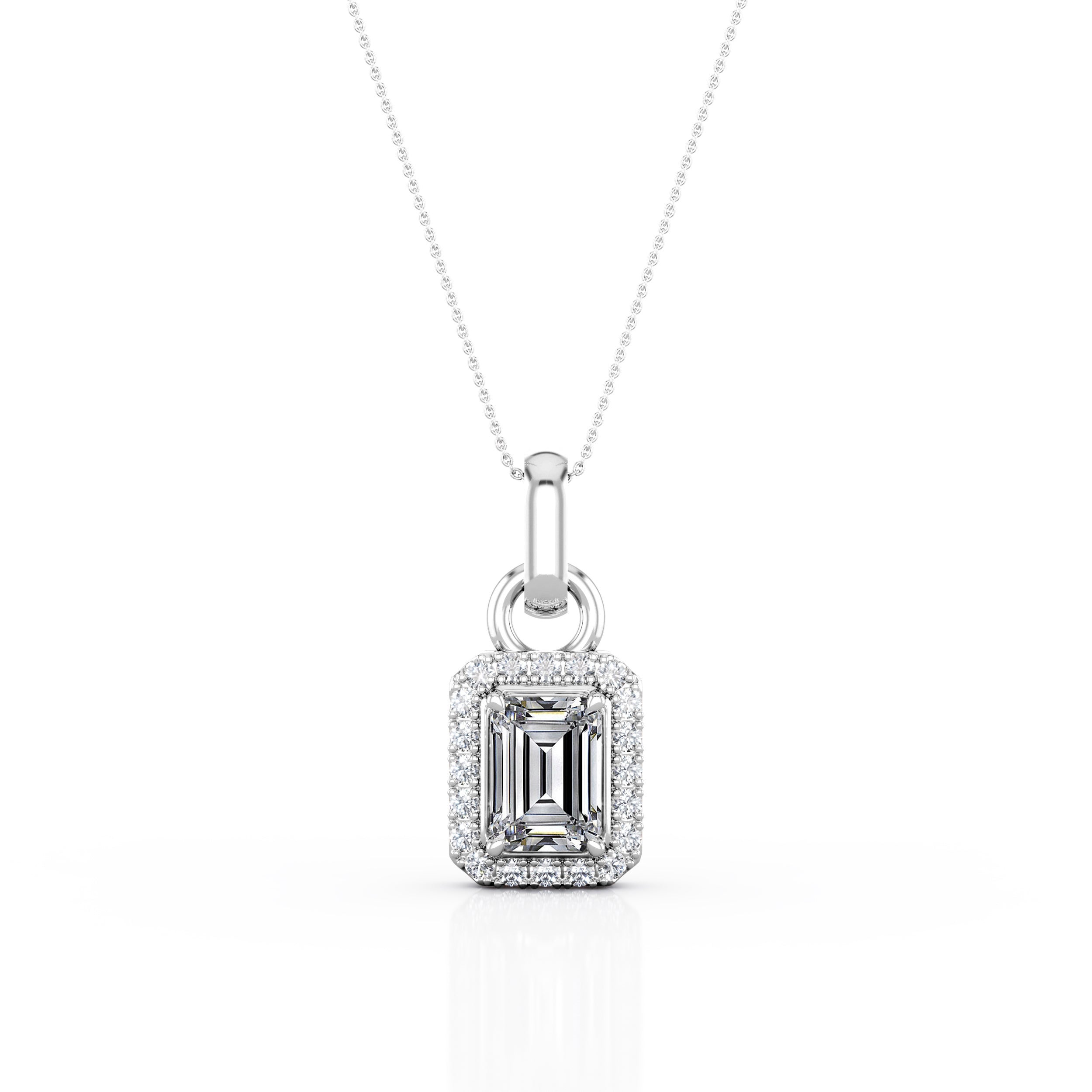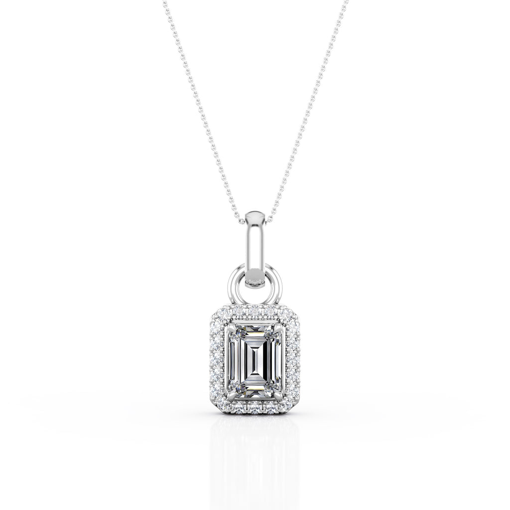 Four Claw Setting 1.10 Carat Emerald cut Certified Moissanite and Diamond Shared Prong Halo Stud Pendant Necklace