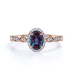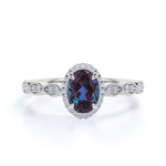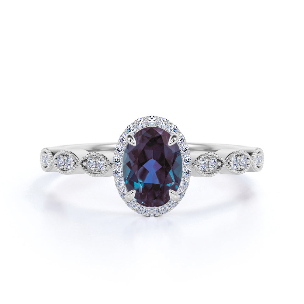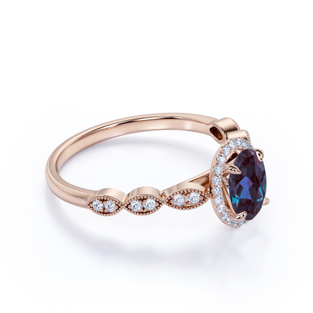 Be on cloud nine with this Four Claws Under Halo 1.50 Carat Oval Cut Synthetic Alexandrite and Diamond Marquise Dot Art Deco Engagement Ring. This vintage ring features 1 carat oval cut lab grown Alexandrite and .50 carat real genuine side diamond for gold ring and moissanite for silver ring. This halo engagement ring can be customized to either 10k, 14K and Gold over Silver and either Black Gold, Rose Gold, White Gold or Yellow Gold. Also, as your satisfaction is our most priority, we will do our best to have your handmade jewelry be carefully and beautifully crafted by our expert jewelers. The order also comes with a 30-day full refund policy. Crowned as June birthstone, this flawless synthetic Alexandrite ring will bring hope as well as encouragement to you. Design your own flawless look with this ring which you can customize it as per your satisfaction. If you are looking for the encouragement to love and romance, this ring is right for you. If you are searching for some alternate gemstone, this Friday's stone ring will be your right choice. Own this ring which displays one of the most remarkable color changes and stand out from the rest. This flawless simulated Alexandrite ring will be a perfect match for those who are looking for beautiful, classic, vintage and antique synthetic Alexandrite pieces of fine jewelry. This ring will surely complement every style of its wearer. This ring is available at a very affordable price yet it offers a very expensive and gorgeous look on your finger. Impress your special someone with this beautiful and affordable lab created Alexandrite ring. It is the perfect match for those who are looking for a remarkable gemstone rings as Alexandrite embodies their own unique color-change ability and uplifting meaning.