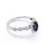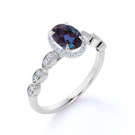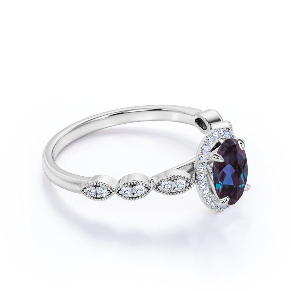 Four Claws Under Halo 1.50 Carat Oval Cut Synthetic Alexandrite and Diamond Marquise Dot Art Deco Engagement Ring