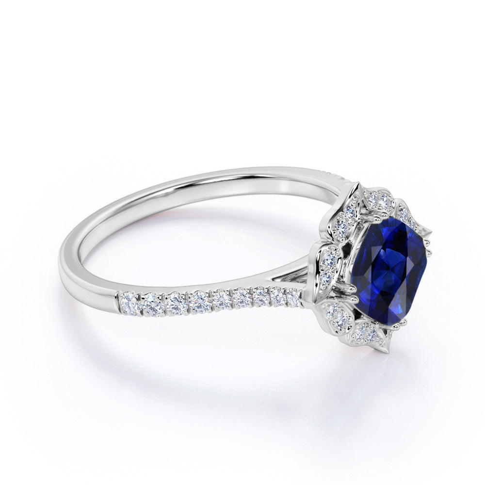 Four Petal Flower Design 1.50 Carat Cushion Cut Sapphire and Diamond Engagement Ring in White Gold