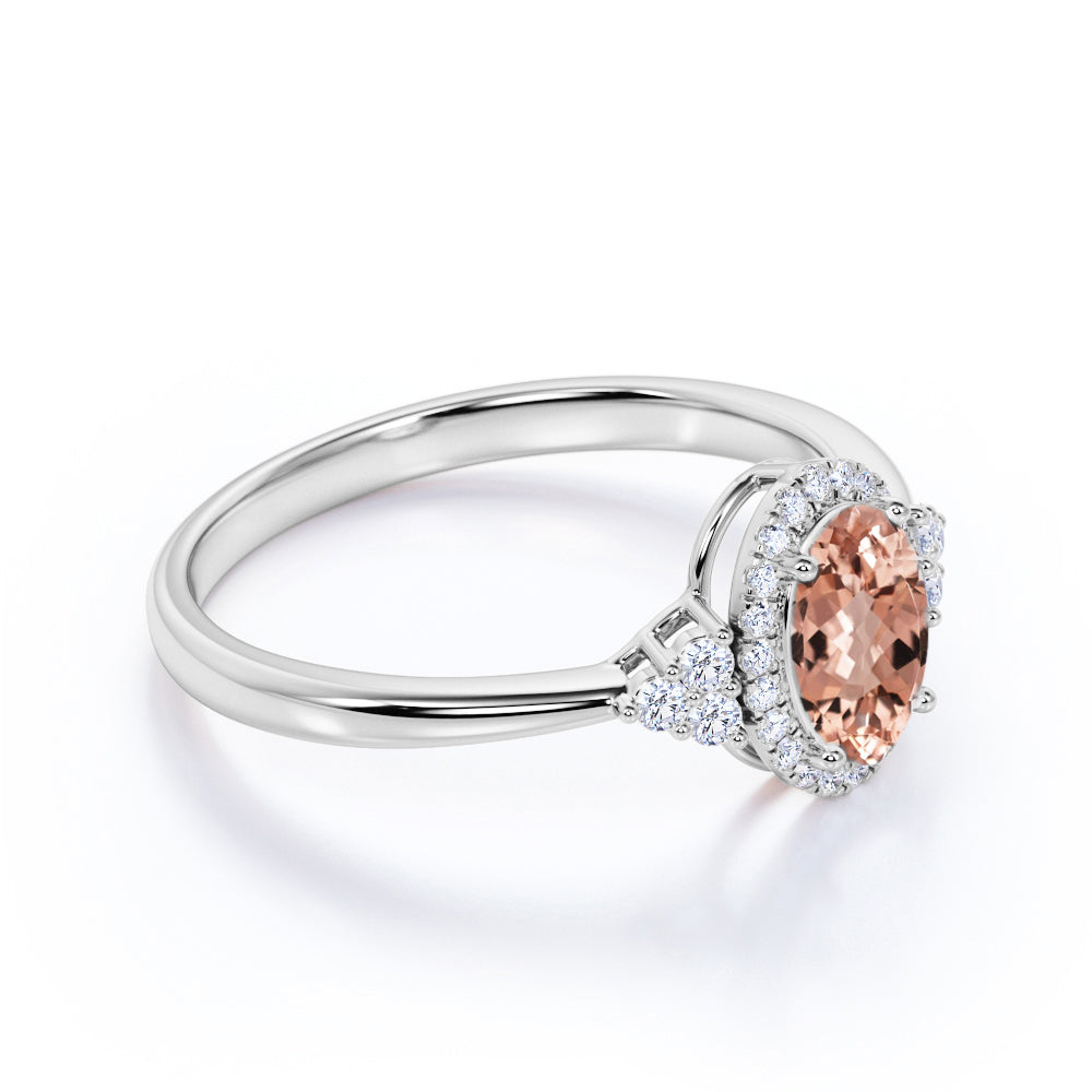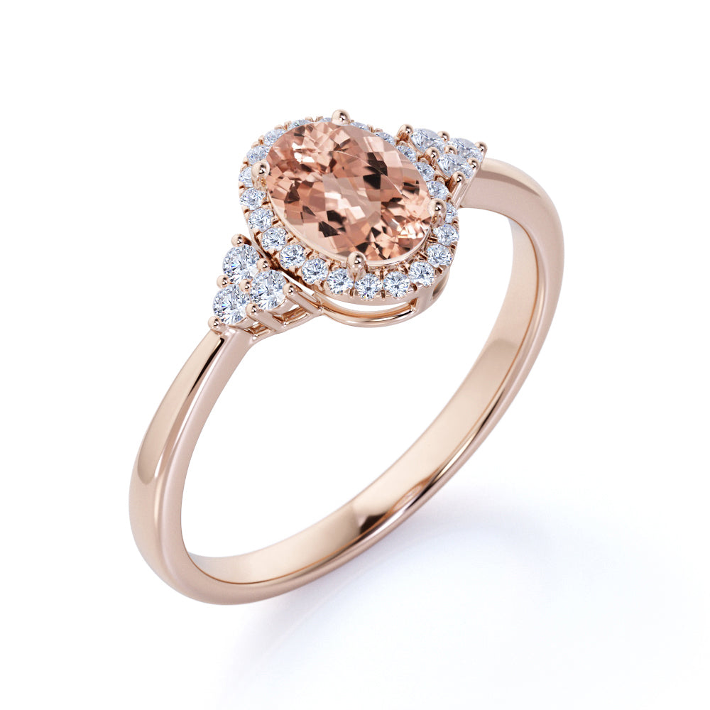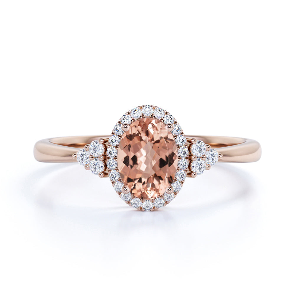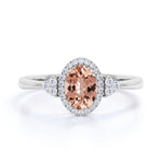 Four Prong 1.15 Carat Oval Cut Morganite and Six Stone Diamond Engagement Ring in Rose Gold