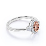 This is a 1.50 Carat Oval Cut Morganite and Six Stone Diamond Engagement Ring in Rose Gold. The four prong set design engagement ring features 1 carat oval cut peach morganite in the center, surrounded with 0.15 carat of diamonds, for a total carat weight of 1.15 Carats.