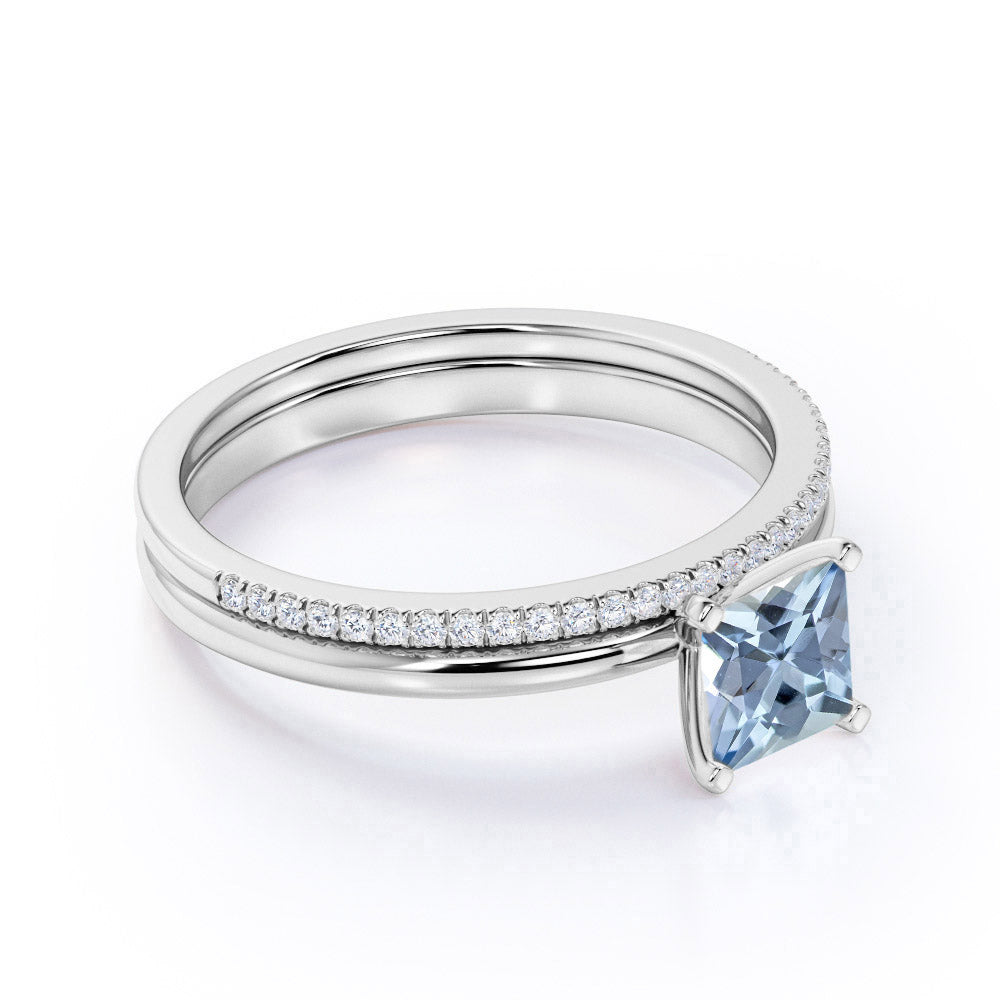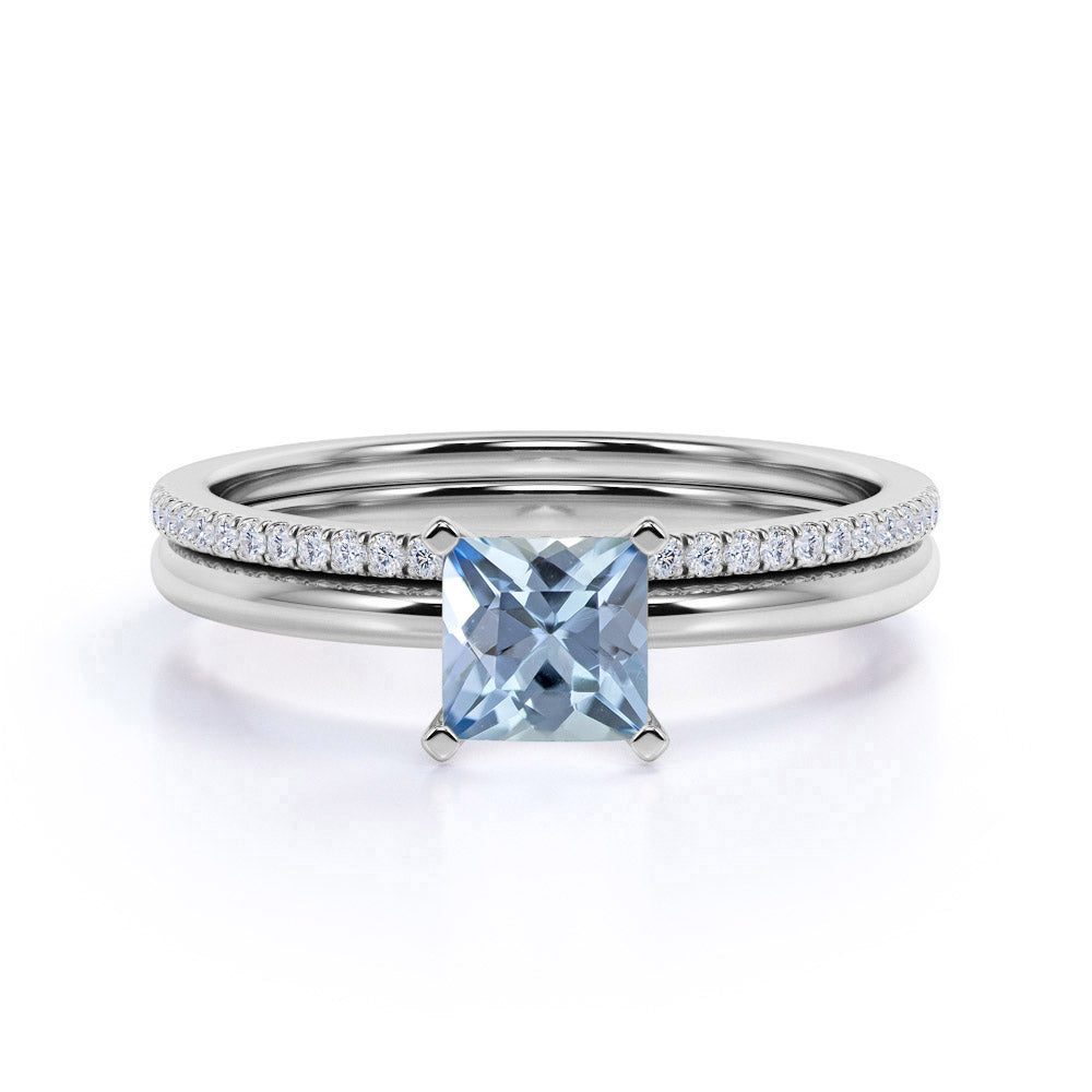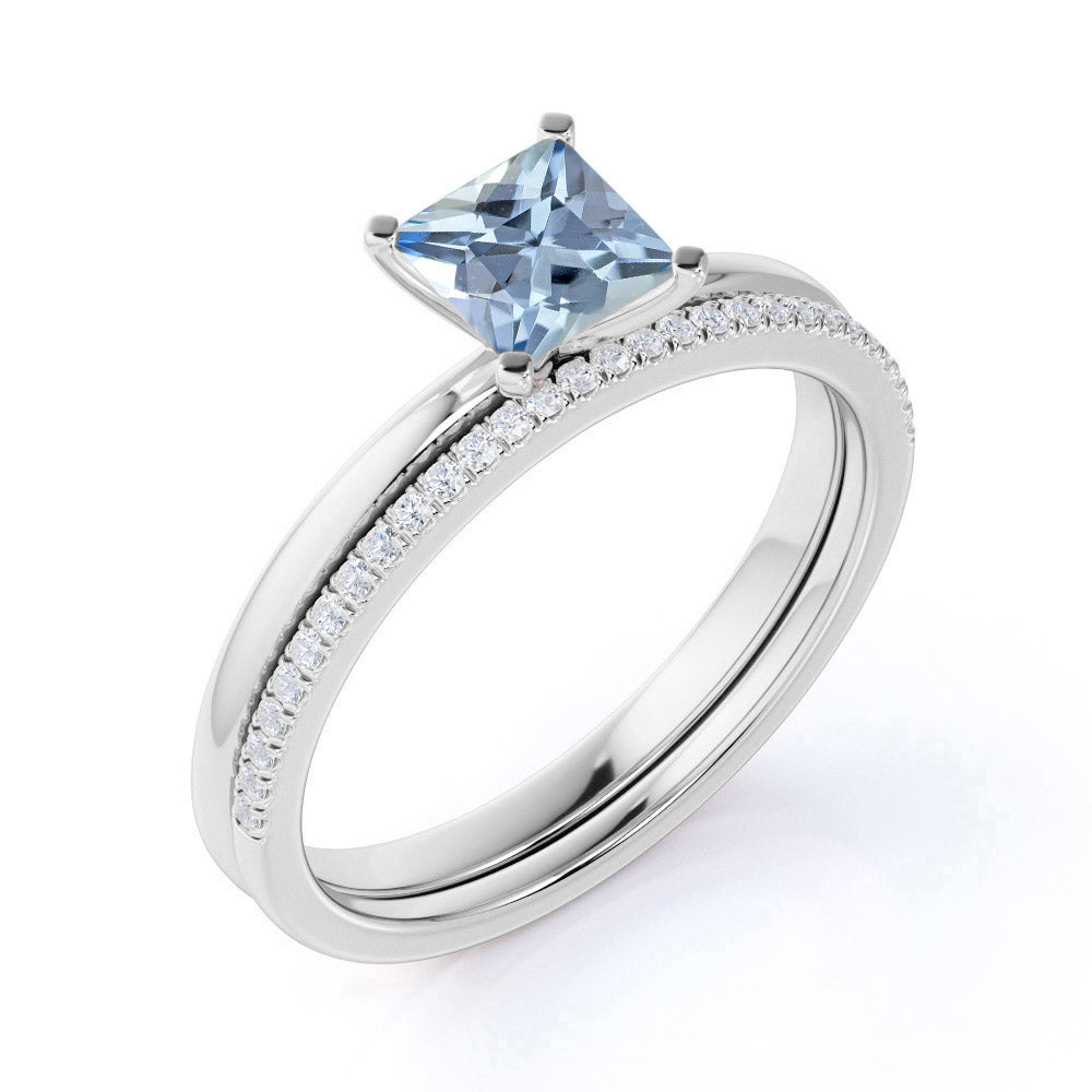 Make her sparkle with this beautiful pale tone of blue aquamarine that captures the shade of light blue sky. This sparkling four prong style wedding ring set features the main engagement ring 1 carat princess cut real blue aquamarine in the center stone together with a matching band have 0.25 carat moissanites, for a total weight of 1.25 carat on real real 18k white gold over silver. Also, as your satisfaction is our most priority, we will do our best to have your handmade jewelry be carefully and beautifully crafted by our expert jewelers. The order also comes with an elegant jewelry ring box and with 30 days full refund policy. This Blue Aquamarine and Moissanite wedding ring set will surely mesmerize your loved one and it's the perfect alternative gift to celebrate love, whether itās for engagement, valentine's day, motherās day or anniversary.