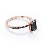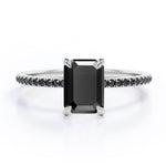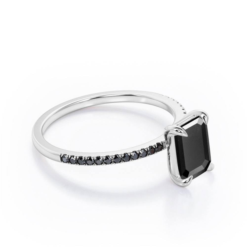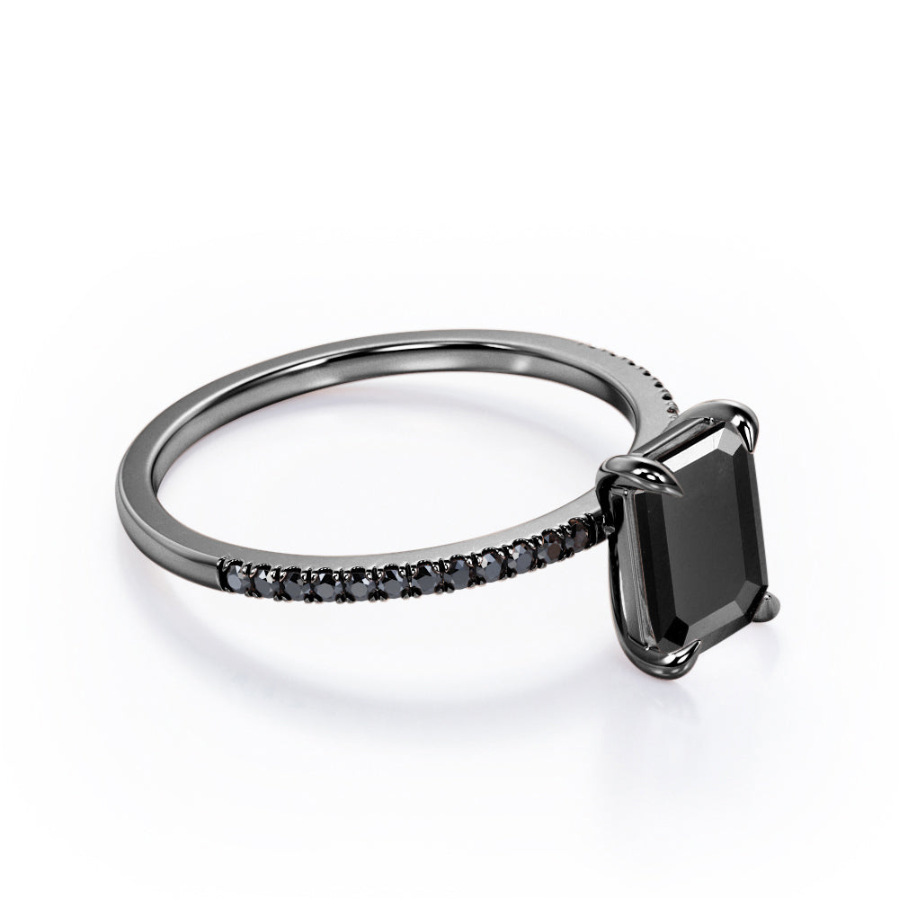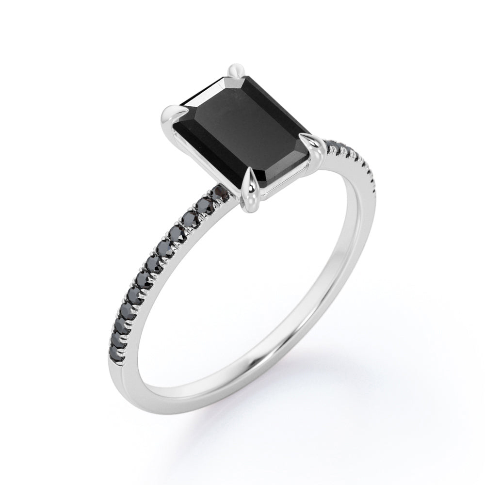 Paint your love story with this Four Prong - 1.25 TCW Emerald Cut Lab Created Black Diamond - Engagement Ring with Pave Accents in White Gold. Skillfully hand-cut into a nice emerald cut by our experts in lapidary, this elegant black diamond anniversary band is composed of total 1.25 carat lab created black diamond on solid white gold. Special and non-traditional, this black diamond ring is perfect for those who would love to express their charisma and uniqueness. Reflective properties of this black diamond ring will enhance happiness and attract positive vibes. This black diamond promise ring is beautiful and accessible since it is available at a reasonable price. For those who have no idea what to surprise your life partners, this black diamond ring can be a good choice for any special occasion, i.e. a birthday ring, an engagement or marriage proposal ring, a Valentines' day ring, etc. Also, this black diamond anniversary band can be customized to your own choice of metal colors: white gold, rose gold, yellow gold or black gold in 10k and 14k gold metal options. Let's fulfill your love story with this black diamond gemstone ring and she will be eternally joyful.