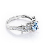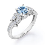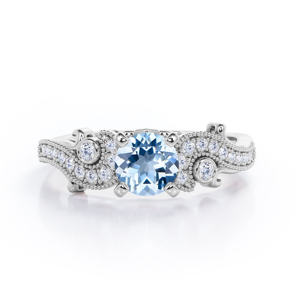 Four Prong 1.35 Carat Round Cut Aquamarine and Diamond Vintage Milgrain Engagement Ring In White Gold. With this nostalgic piece of jewelry comes an innate sense of history and a strong feeling of romance. If you and your partner have decided to go the vintage route, choose this vintage inspired Aquamarine and diamond engagement ring to embark on a new chapter of your life. This art deco engagement ring features 1 carat round cut aquamarine as the center stone and 0.35 carat diamonds. The pave set diamonds radiates amazing brilliance and undeniable sparkle which will make you outshine for sure. The beaded edges and art deco pattern in the white gold band reflects the vintage era. Handmade with love and attention, this four prong 1.35 carat round cut aquamarine and diamond vintage milgrain engagement ring in white gold can also be customized into 18k gold over silver, 10k Gold or 14k Gold as per your preference. Please note that if the ring is made over silver, the side stone will be moissanite and if it is made on gold, diamond will be engraved as the side stone.