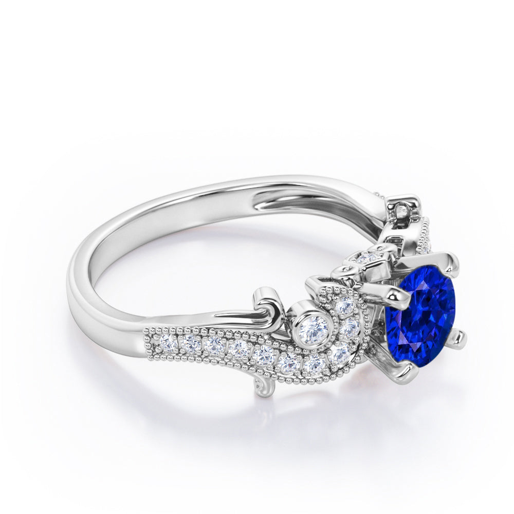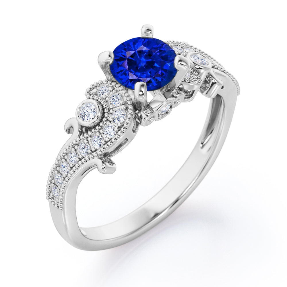 Four Prong 1.35 Carat Round Cut Sapphire and Diamond Vintage Milgrain Engagement Ring In Rose Gold. With this nostalgic piece of jewelry comes an innate sense of history and a strong feeling of romance. If you and your partner have decided to go the vintage route, choose this vintage inspired Sapphire and diamond engagement ring to embark on a new chapter of your life. This art deco engagement ring features 1 carat round cut sapphire as the center stone and 0.35 carat diamonds. The pave set diamonds radiates amazing brilliance and undeniable sparkle which will make you outshine for sure. The beaded edges and art deco pattern in the rose gold band reflects the vintage era. Handmade with love and attention, this four prong 1.35 carat round cut sapphire and diamond vintage milgrain engagement ring in rose gold can also be customized into 18k gold over silver, 10k Gold or 14k Gold as per your preference. Please note that if the ring is made over silver, the side stone will be moissanite and if it is made on gold, diamond will be engraved as the side stone.
