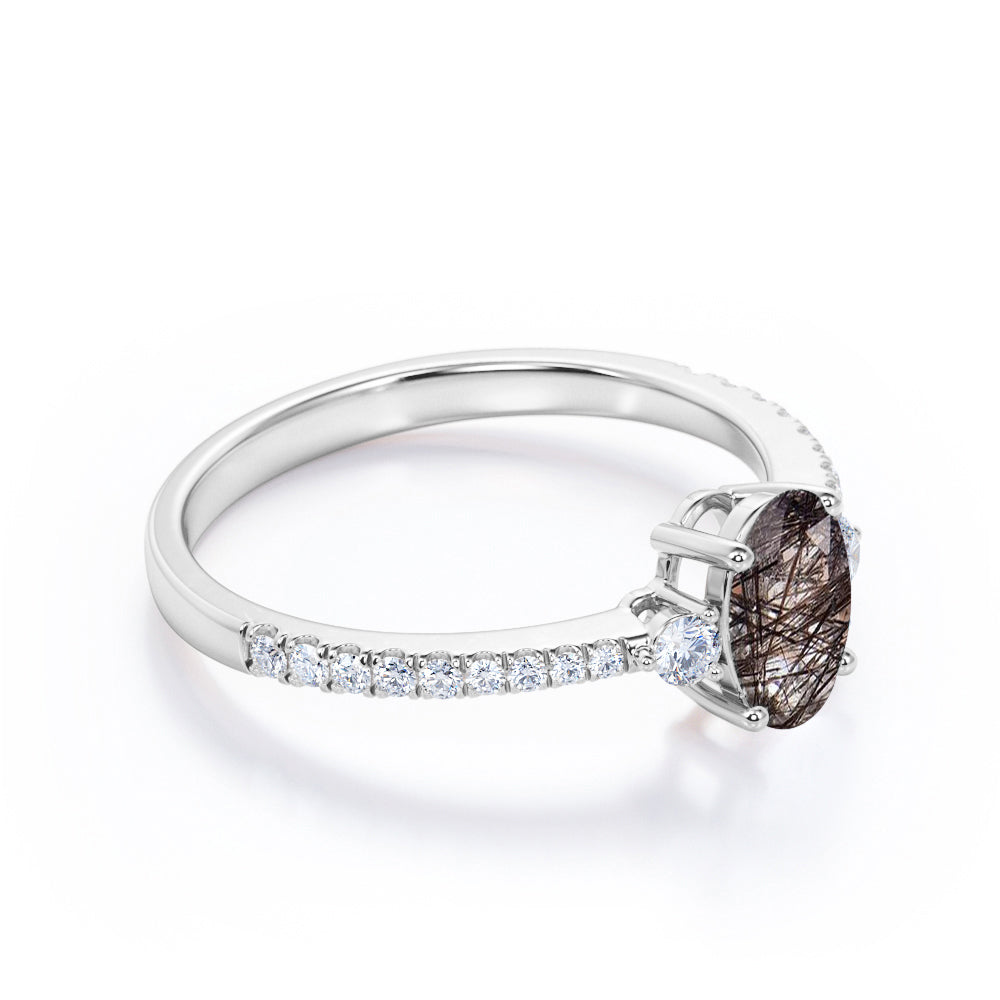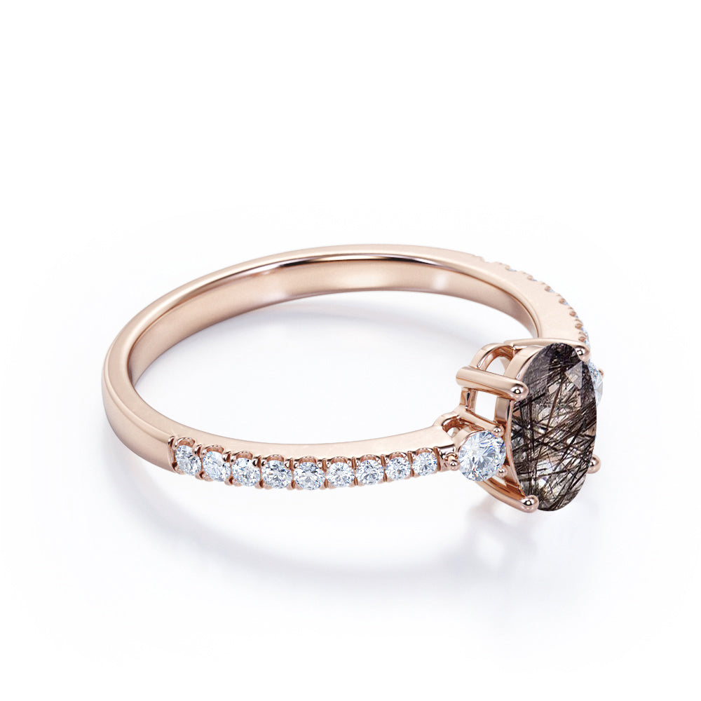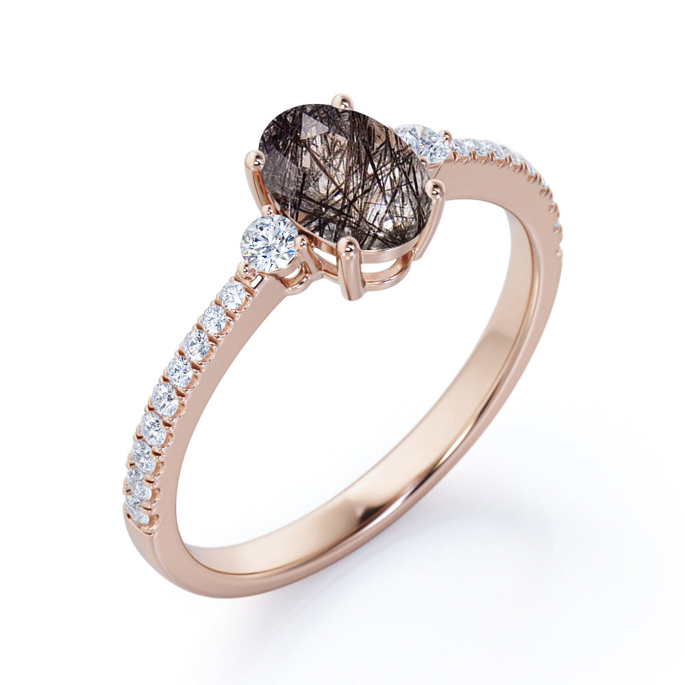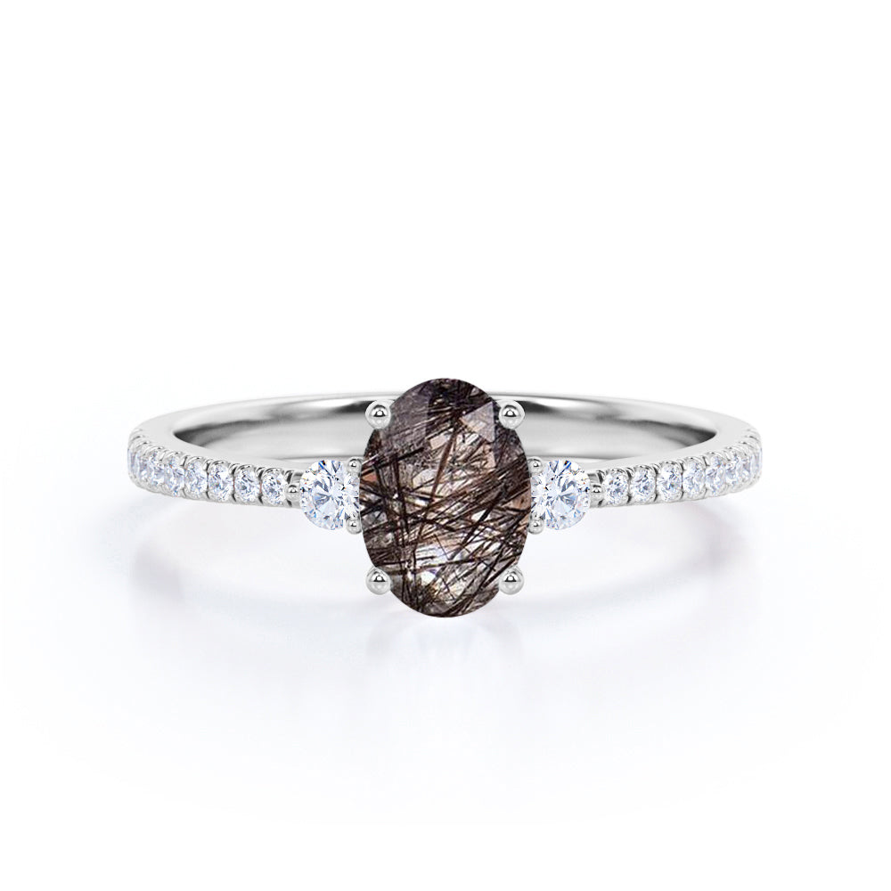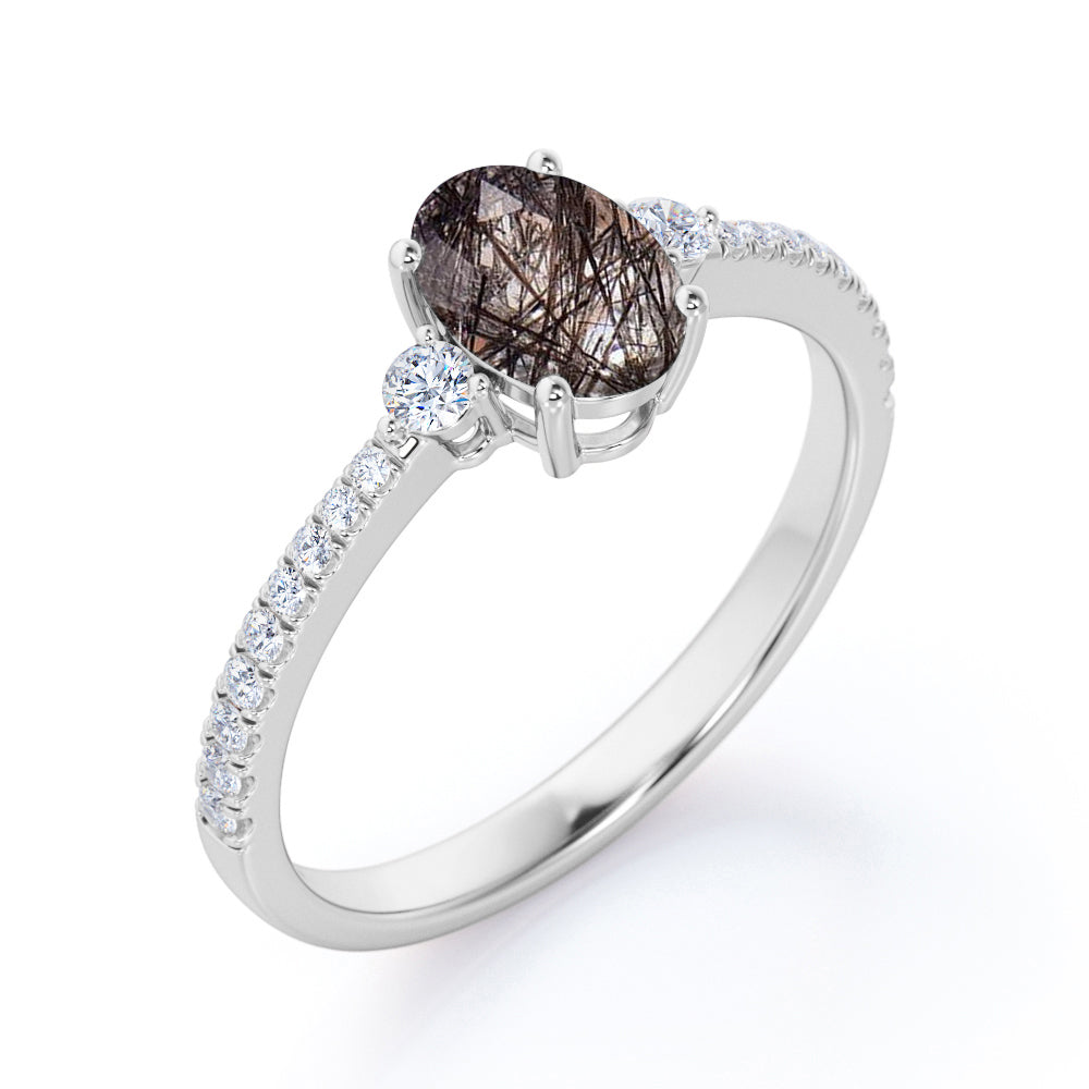 Create an incredibly beautiful look on her finger with this Four Prong Basket 1.50 Carat Oval Cut Natural Brown Hair Rutilated Quartz and Diamond 3 Stone Pave Engagement Ring. This 4 prong basket setting solid dendritic rutilated quartz engagement ring features 1 carat oval cut real rutilated quartz and .50 carat genuine side diamond for gold ring and moissanite for silver ring. This elegant three stone engagement ring can be customized to either 10k, 14K and Gold over Silver and either Black Gold, Rose Gold, White Gold or Yellow Gold. Also, as your satisfaction is our most priority, we will do our best to have your handmade jewelry be carefully and beautifully crafted by our expert jewelers. The order also comes with a 30-day full refund policy. This clear crystal with black needle inclusions ring will surely be a perfect gift for your significant other. It is believed to attract a good match, increase appeal, and fascinate with your own personality. This tourmalinated black rutilated quartz is believed to be a protection against the ill thoughts of others. Own this ring which displays a combination of quartz and rutile that creates an amazing vibration and stand out from the rest. Perfect for everyday wear, this solid rutilated quartz ring is resistant to chemical attack. It can be customized as per your satisfaction and available in both silver and gold metal. Precisely handcrafted and created to be unique, no two rings are exactly alike because of its unique pattern of needle inclusions. Being considered a powerful amplifiers of thoughts, this natural rutilated quartz ring offers connection to the Divine mind and receipt of Divine inspiration. Those who has a penchant for vintage and flawless ring would completely fall in love with this ring. With its mesmerizing patters of colors and inclusions, this rutilated quartz ring will enchant your special someone with gracefulness.