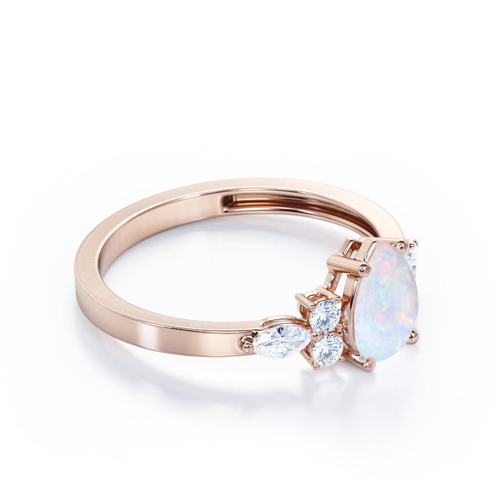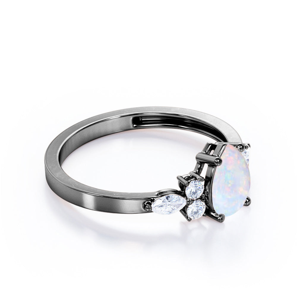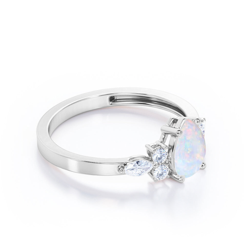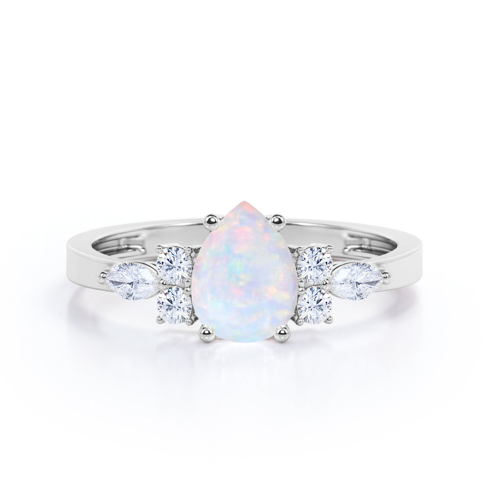 Four Prong Basket Set 1.35 Carat Pear Cut Ethiopian Opal And Diamond Seven Stone Engagement Ring In White Gold. This majestic and distinctive opal and diamond engagement ring makes a statement with six small diamonds clustered around the center opal stone. Worn alone, taking the place of both an engagement ring and wedding band, or stacked with another band style, our seven stone ring is eye-catching. This tantalizing piece features 1 carat luscious opal center stone in a classic four prong basket setting and 0.35 carat of three set of diamond stones of mixed shapes in either side which illuminates wonderful sparkle. This four prong basket set 1.35 carat pear cut Ethiopian opal and diamond seven stone engagement ring in white gold can also be customized to 18k Gold plating over silver,10k Gold or 14k Gold as per your preferred choice.So, hurry up and make this alluring piece yours forever by simply pressing the add to cart button below.