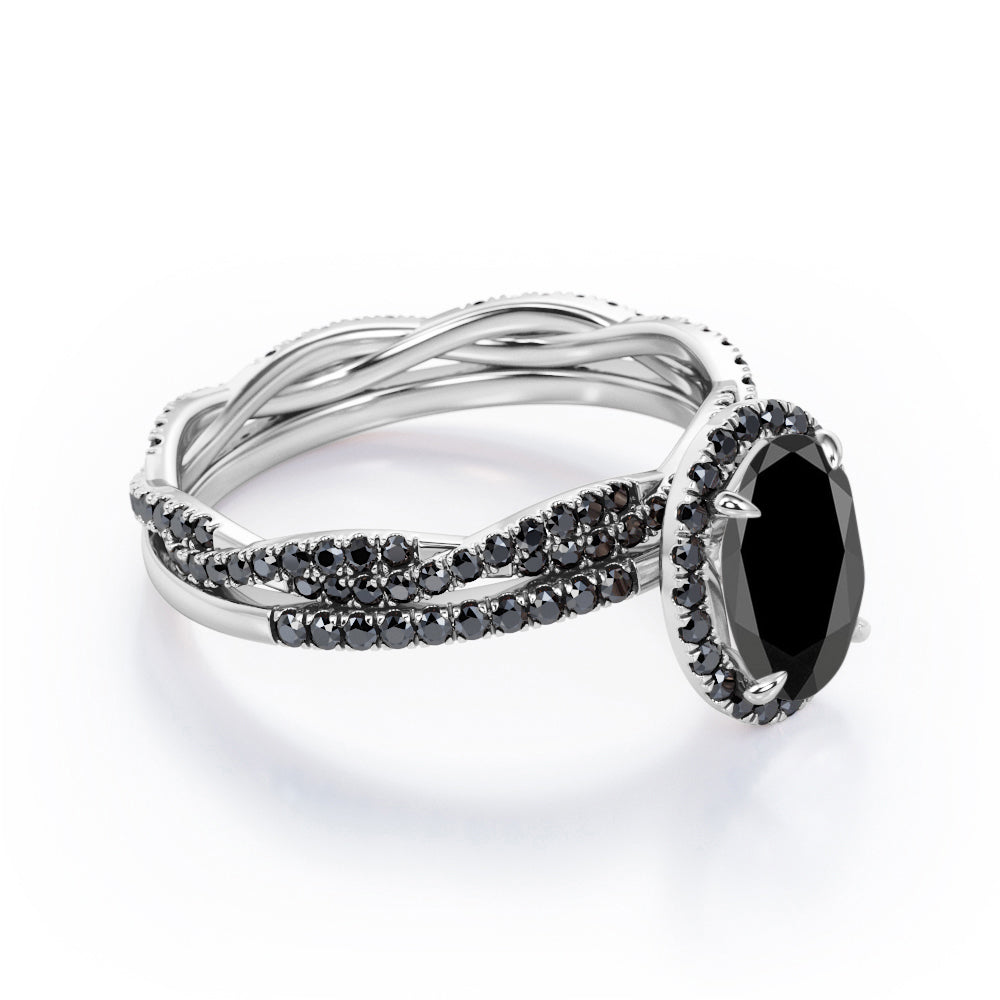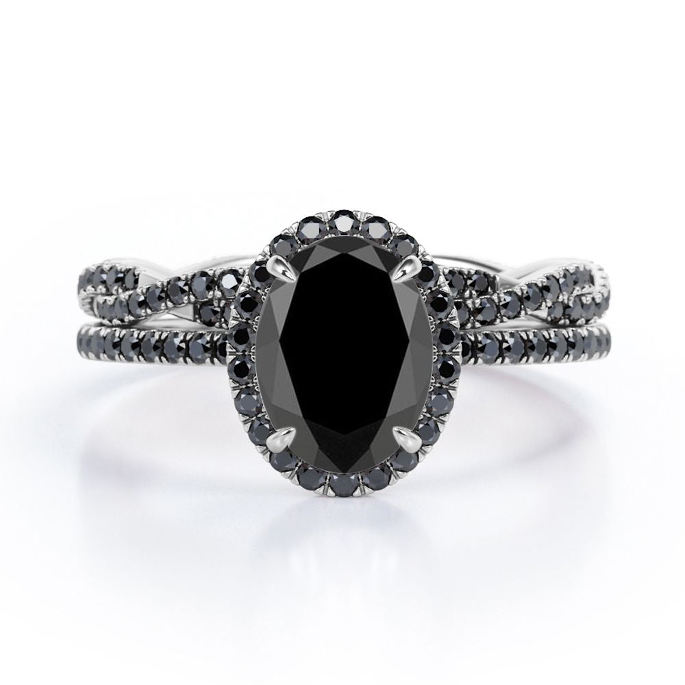Be highly fashionable with this Four-Prong Halo 1.75 TCW Oval-Shaped Lab Created Black Diamond Pave Twisted Eternity Bridal Set in White Gold. Professionally handcrafted into a fine oval cut by our experts in lapidary, this alluring statement black diamond rings set integrates total 1.75 carat lab created black diamond on solid white gold. Special and non-traditional, this synthetic black diamond ring set is well-suited for those who are not quite into normal lifestyle. Reflective properties of this black diamond gemstone ring set will absolutely enhance every style of its wearer. This black diamond ring set is beautiful and accessible since it is available at an affordable price. Considered as a symbol of eternal love and affection for your lover, this black diamond ring set can be a perfect gift for any occasion like engagements, Valentine's day, mother's day or anniversary. Also, this black diamond gemstone ring set can be customized, so customers can choose one of metal colors between white gold, rose gold, yellow gold or black gold in 10k and 14k gold metal options. Let’s impress her with this black diamond ring set and she will be eternally joyful.