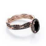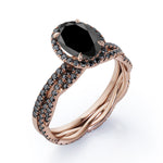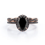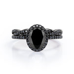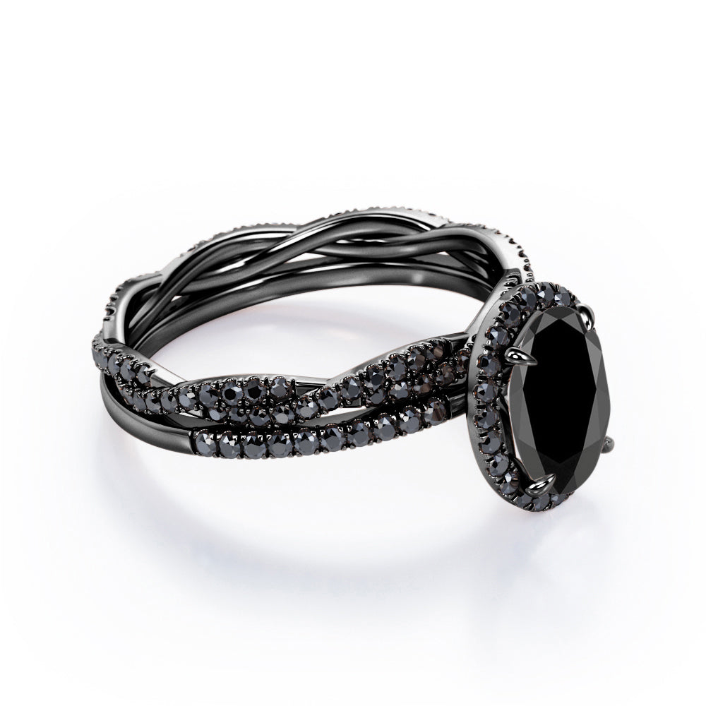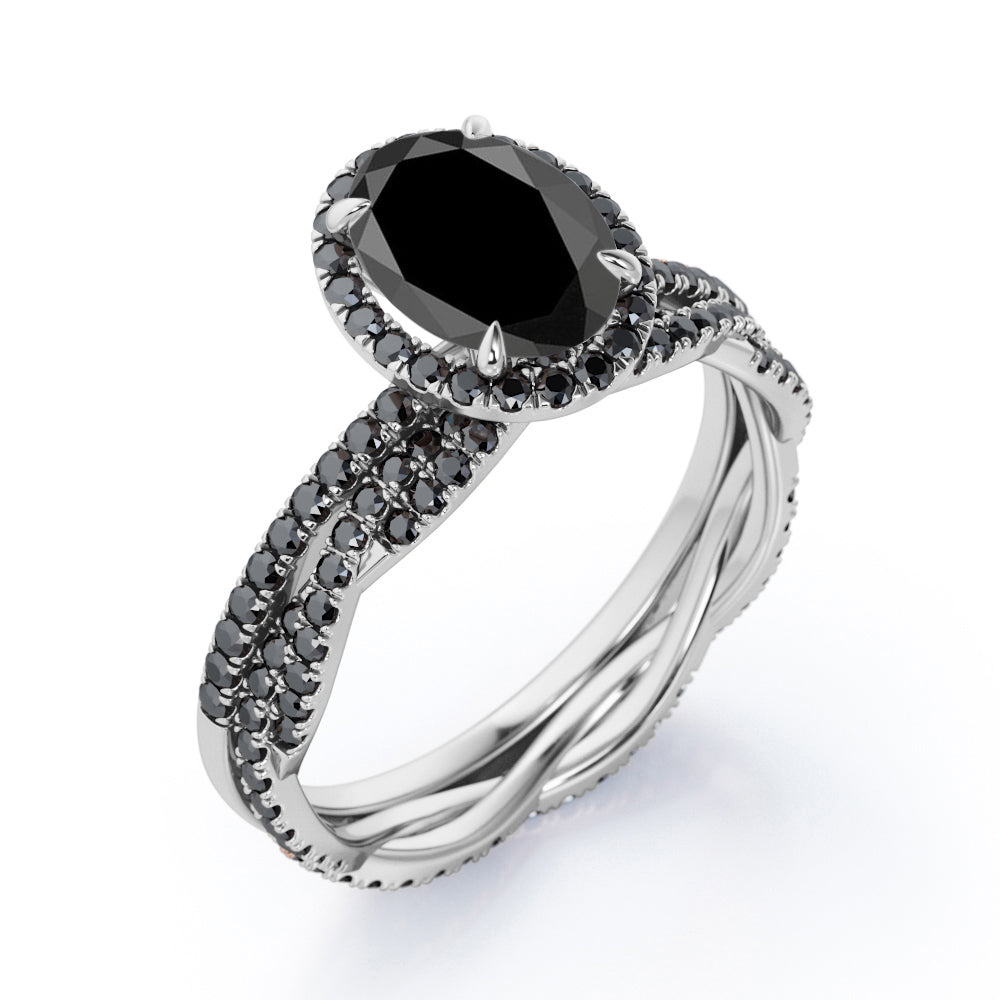 Be highly fashionable with this Four-Prong Halo 1.75 TCW Oval-Shaped Lab Created Black Diamond Pave Twisted Eternity Bridal Set in White Gold. Professionally handcrafted into a fine oval cut by our experts in lapidary, this alluring statement black diamond rings set integrates total 1.75 carat lab created black diamond on solid white gold. Special and non-traditional, this synthetic black diamond ring set is well-suited for those who are not quite into normal lifestyle. Reflective properties of this black diamond gemstone ring set will absolutely enhance every style of its wearer. This black diamond ring set is beautiful and accessible since it is available at an affordable price. Considered as a symbol of eternal love and affection for your lover, this black diamond ring set can be a perfect gift for any occasion like engagements, Valentine's day, mother's day or anniversary. Also, this black diamond gemstone ring set can be customized, so customers can choose one of metal colors between white gold, rose gold, yellow gold or black gold in 10k and 14k gold metal options. Let’s impress her with this black diamond ring set and she will be eternally joyful.