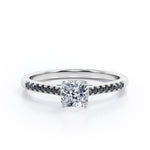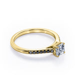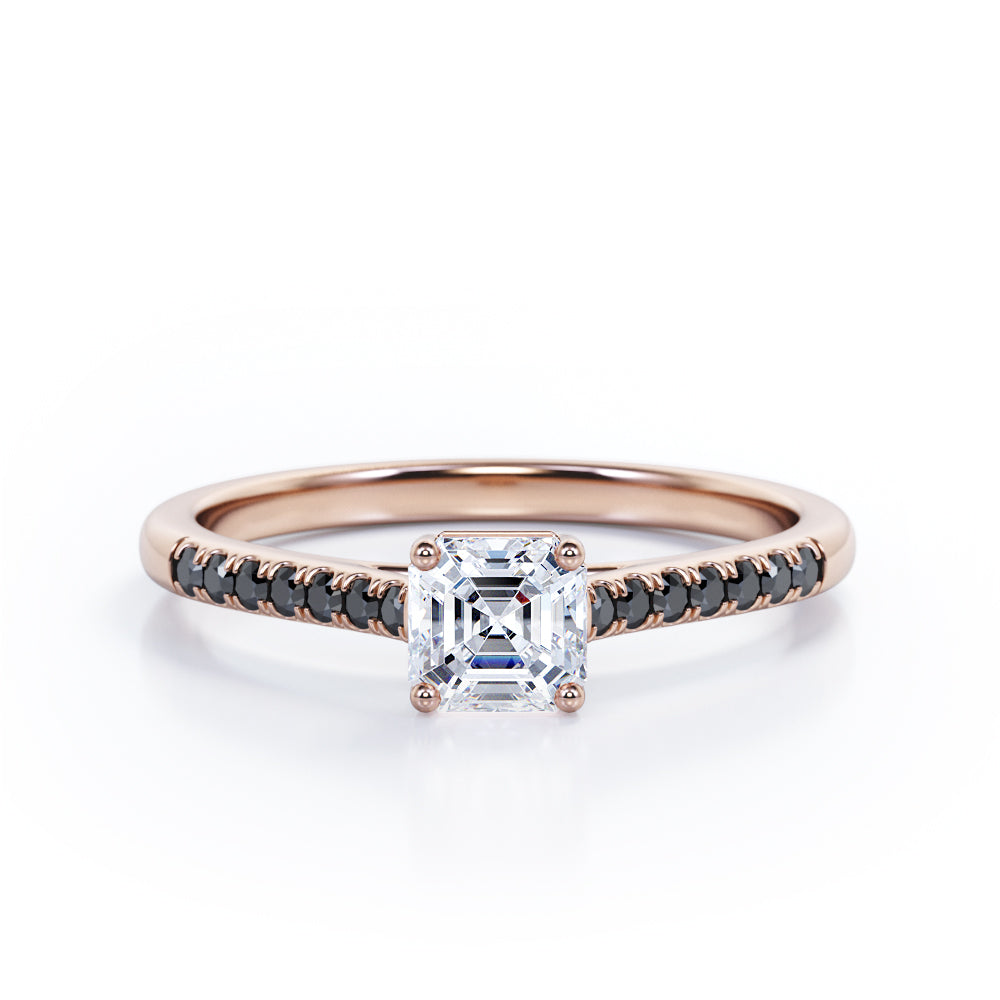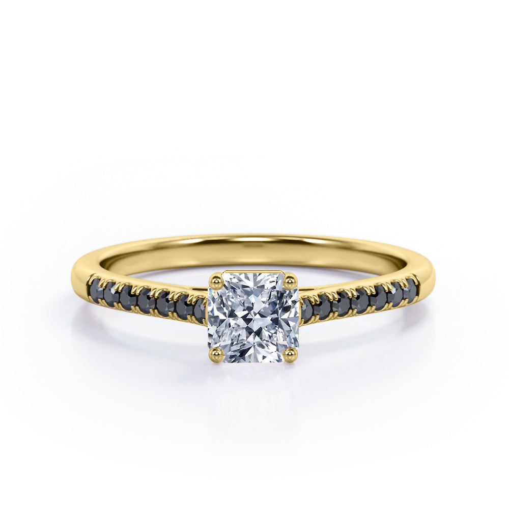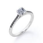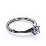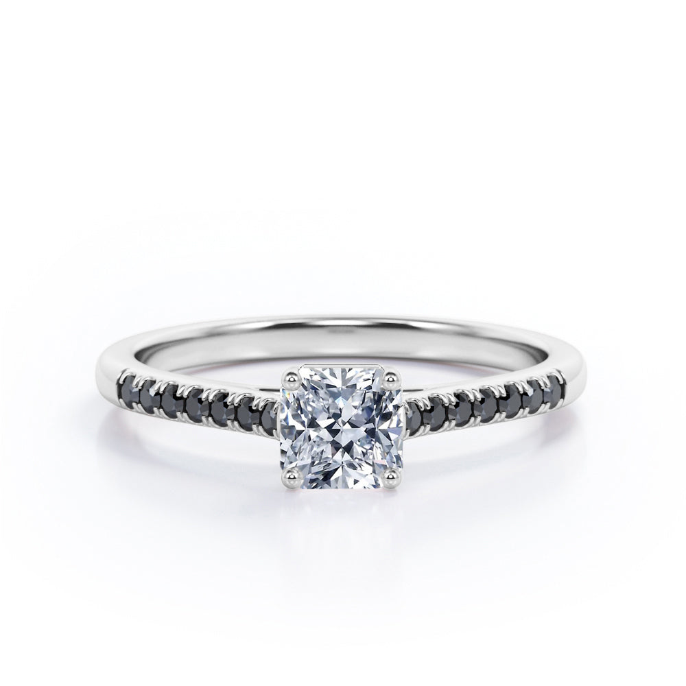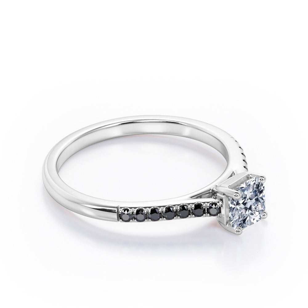 With this Four Prong Set - 1.25 TCW Princess Cut Moissanite with Lab Created Black diamond - Scalloped Pave Engagement Ring in White Gold, your significant other will be on cloud nine all the time. Hand-cut with deftness into a lovely shape princess cut by our lapidary expertise, this splendid affordable wedding ring combines total 1.25 carat Moissanite with lab-created Black diamond side stones on solid white gold. For those looking for something a little out of the ordinary, this Moissanite promise ring is ideal for those who wish to express their charisma and uniqueness. This Moissanite ring for women will accentuate any outfit the wearer chooses to put on. This Moissanite wedding ring is stunning and inexpensive, thanks to its reasonable price. This Moissanite wedding ring is a great choice. Also, this vintage Moissanite ring can be customized, either in White gold, rose gold, yellow gold or black gold in 18k Gold over silver, 10k and 14k gold metal options upon customer request. Your love story will be complete with this affordable Moissanite engagement ring, and she will never regret it.