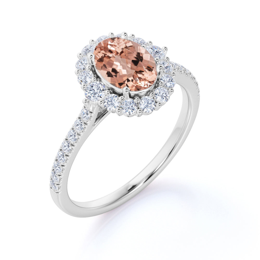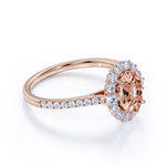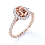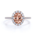 This is a 1.50 Carat Oval Cut Morganite and Diamond Engagement Ring in Rose Gold. The four prong set design engagement ring features 1.25 carat oval cut peach morganite in the center, surrounded with 0.25 carat of diamonds, for a total carat weight of 1.50 Carats.