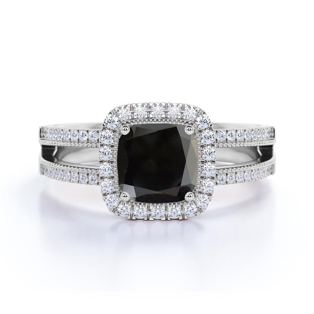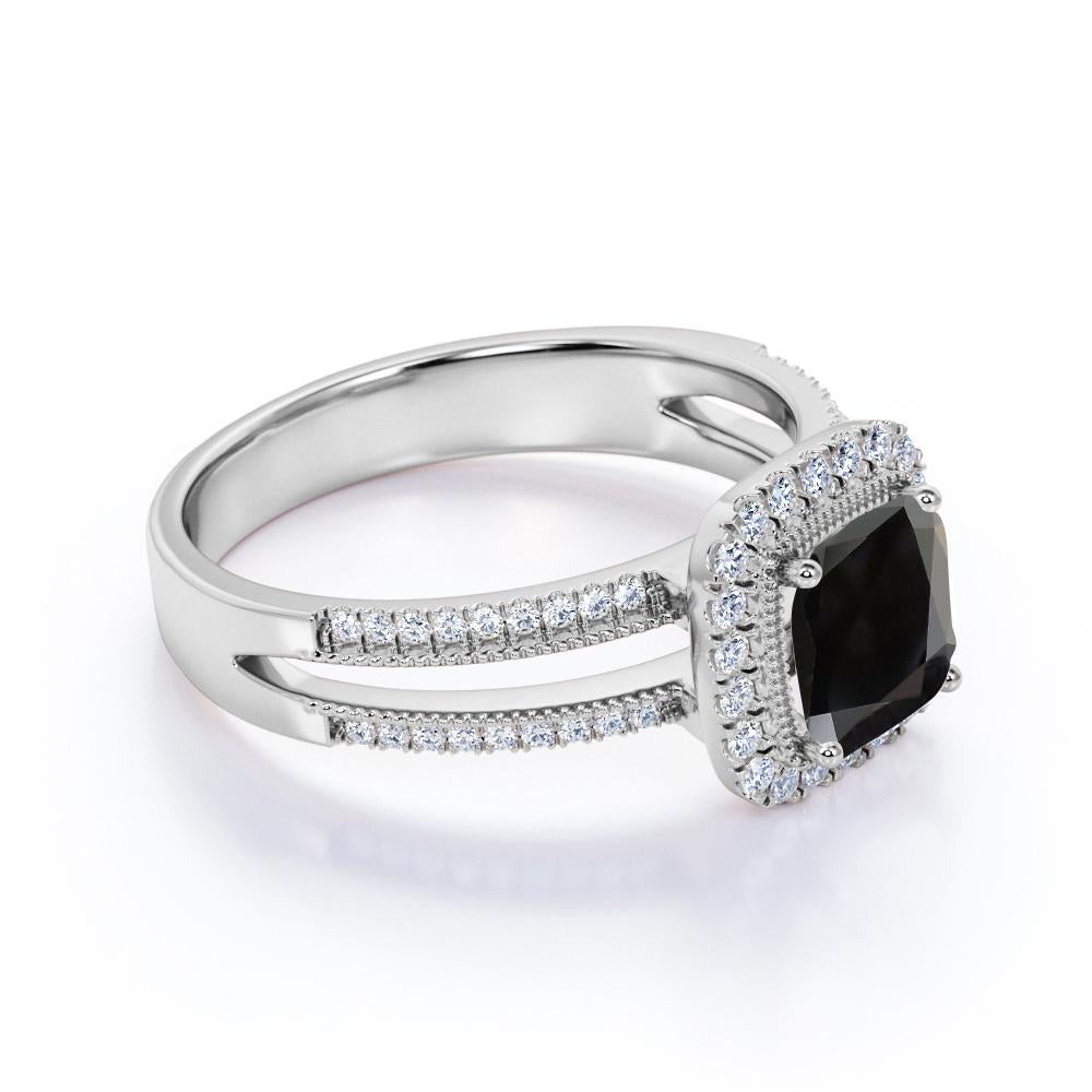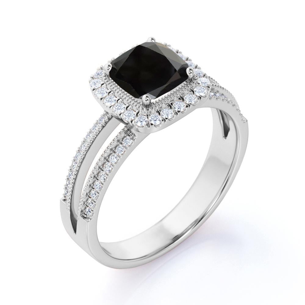 This black diamond ring is also considered the new vintage art deco engagement ring, because of its art deco style that is unique and one of a kind ring design. We can also customize this black diamond engagement ring to become an infinity or eternity band which will reflects your love for each other and that love will surely last forever because of this amazing ring. This black diamond ring features an approximately 1 carat cushion shape lab created black diamond, surrounded by .75 carat certified diamond accent, for a total weight of 1.75 carats.