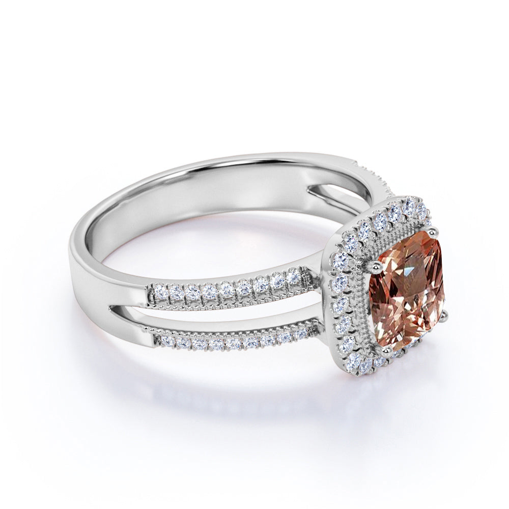 French Pave 1.75 Carat Cushion Orange Morganite and Diamond Halo Split Shank Engagement Ring in White Gold