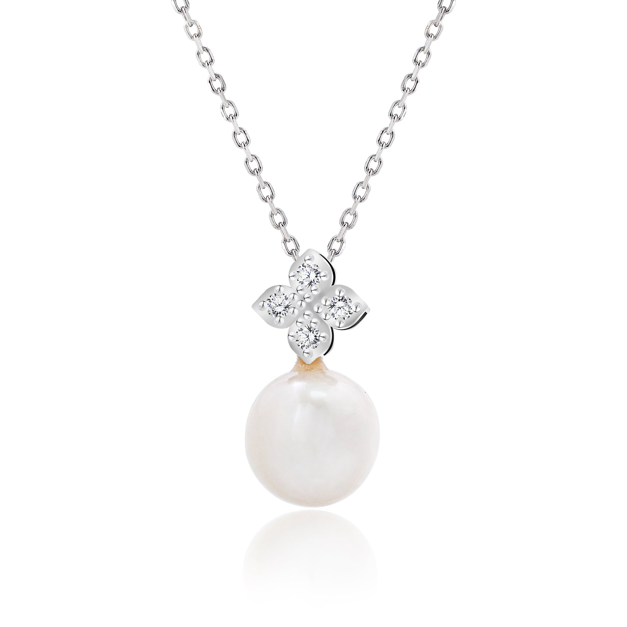 Unleash your inner radiance with our mesmerizing Genuine 8mm Pearl Necklace Pendant and Moissanite Magnolia for Women in 18K White Gold over Silver. This exquisite pendant is a true embodiment of elegance, affordability, and durability, designed to glamorize your everyday look. At the center of this captivating piece is a luminous 8mm pearl accompanied by a magnolia-shaped decoration embellished by moissanite totaling to a total carat weight of 0.08 Carat. The flawless pearl exudes timeless beauty, while the intricate magnolia pendant adds a touch of femininity and grace to this silver necklace with single pearl. With these simple yet, alluring details, the pendant is no doubt one of the most perfect pearl pendant for necklace. Professionally crafted, this pearl flower necklace is a testament to exceptional craftsmanship. The 18K white gold over silver setting enhances its allure, while the moissanite stones add a subtle brilliance that complements the whole piece of this women's pearl pendant necklace. Versatile and affordable, this dainty pearl pendant necklace is a perfect accessory for women of all ages. Whether you're attending a formal event, enjoying a casual outing, or celebrating a special occasion, this cultured pearl pendant will prove to be your go-to piece of jewelry. Pearl Size: 8 MM|Pearl Color: White|Secondary Gemstone: Moissanite|Total Carat Weight: 0.08 Carat|Gemstone Color: Near Colorless|Gemstone Clarity: VS|Metal Type: 18K White Gold Plating over Sterling Silver|Manufacturer: JeenMata